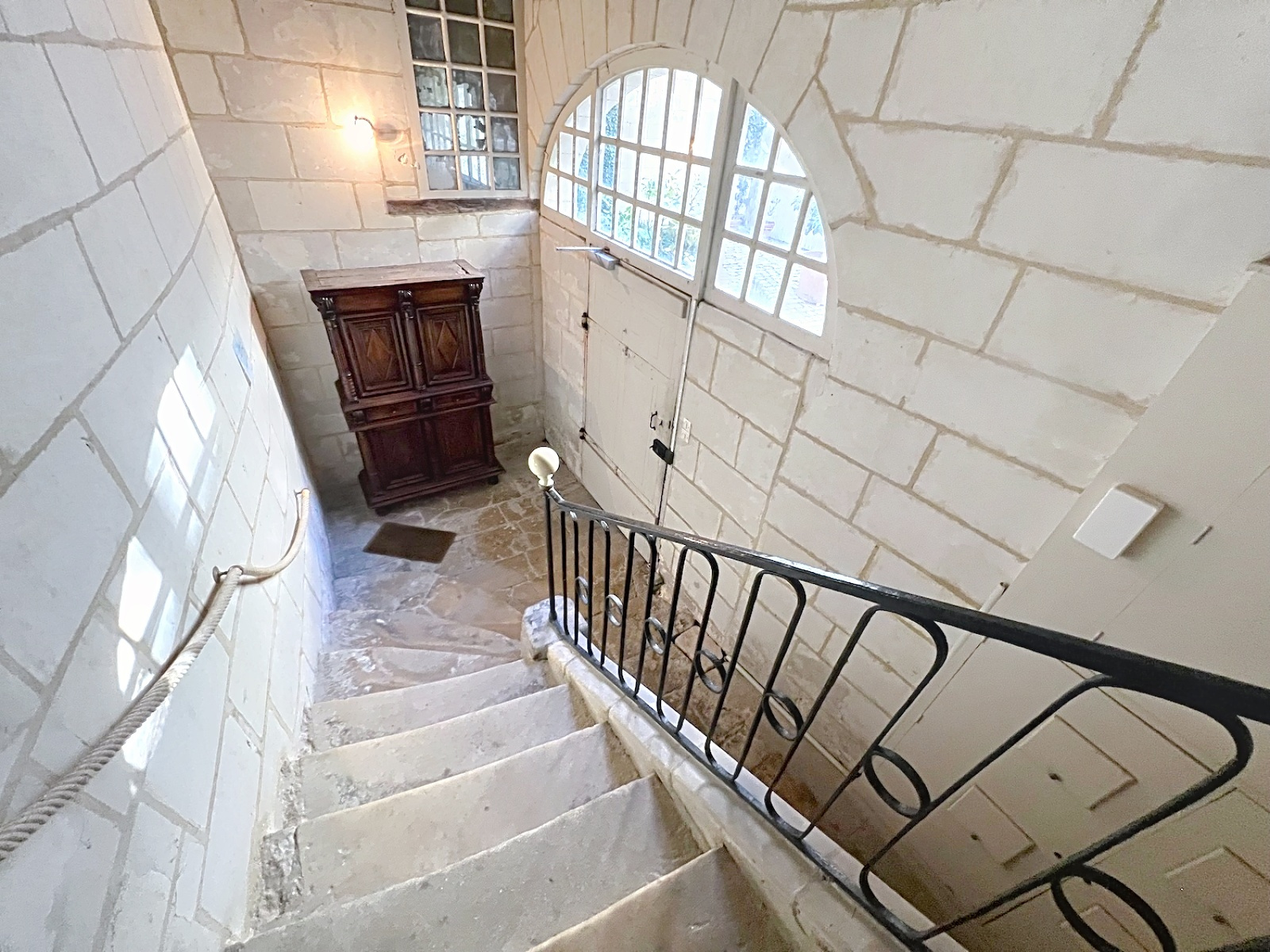 L'escalier tout en pierre dessert les étages de l'immeuble dans une belle ambiance de tuffeau.