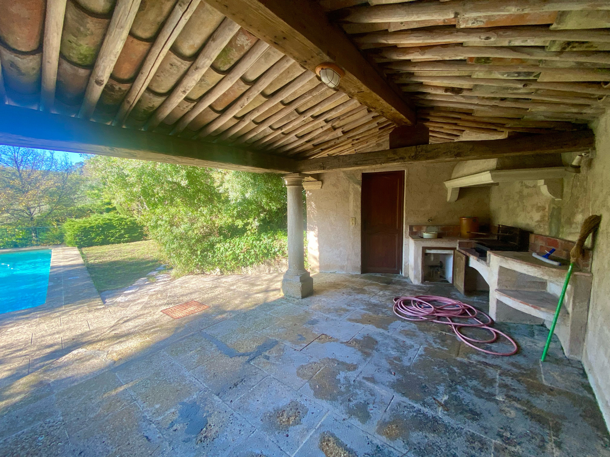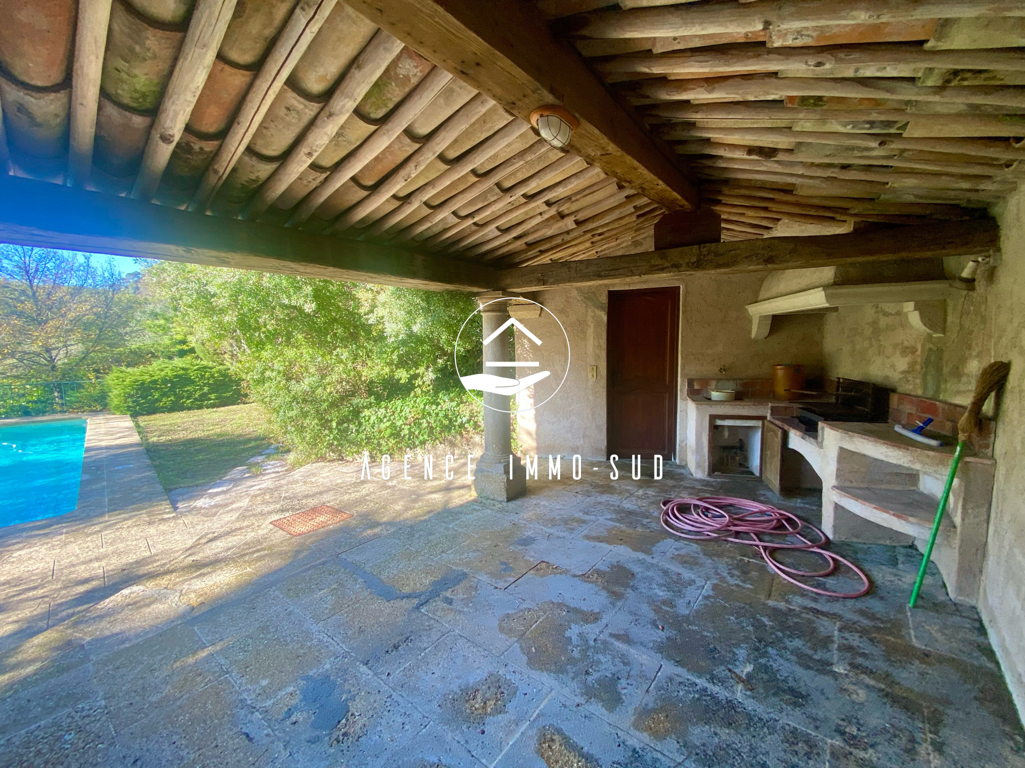 Les extérieurs proposent un terrain arboré, plusieurs espaces détente et un coin piscine au sel comprenant un pool house complet (barbecue, douche et WC).