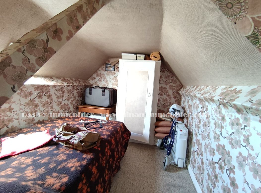 EXCLUSIVITE - DINAN - 10 min à pied du centre, maison nécessitant de gros travaux et traitement parasitaires suite sinistre, comprenant un sous sol total avec partie garage et cave, au rdc une cuisine, une pièce de vie et une véranda, au 1er étage deux chambres et une salle de bains avec WC et grenier au 2ème étage aménagée en 2 pièces. Terrain clos de 468m2.