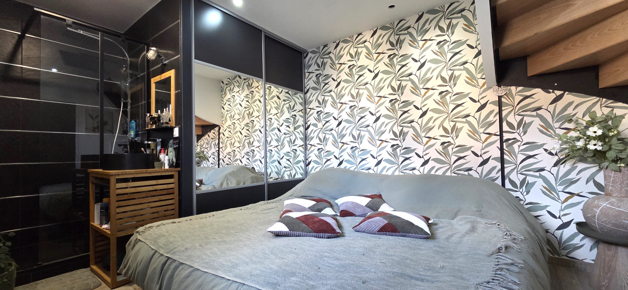 En rez-de-chaussée, un vaste séjour lumineux exposé plein sud avec cuisine ouverte aménagée et équipée, chambre avec salle d'eau privative, buanderie et WC.