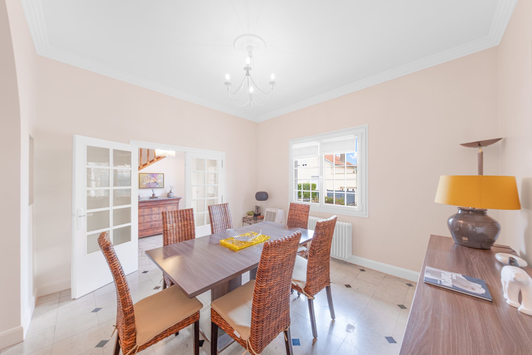 Dans quartier résidentiel entre le centre ville et Toison d'or , jolie villa type 1930 lumineuse, prestations haut de gamme , décoration soignée , état remarquable ; cette maison de caractére vous propose : hall d'entrée distribuant à la fois une trés belle cuisine équipée (accés terrasse à l'abri des regards) , un grand salon avec cheminée pierre , une salle à manger accompagnée d'un autre salon plus intime avec cheminée à insert , un bureau ; A l'étage : 4 chambres , 2 salles de douche équipées , dressing . Matériaux des plus nobles ( sols parquet chêne ou comblanchien avec cabochons) , volets éléctriques , climatisation ect... Sous-sol complet : buanderie avec chaudiére gaz , cave à vin climatisée , garage , studio indépendant . Jardin entiérement clos avec abri voiture (équipé borne électrique)