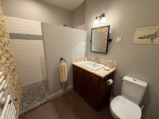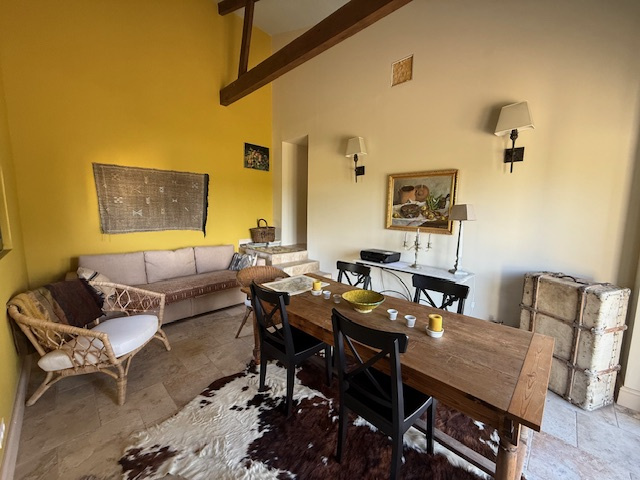 Au RC, séjour autour de la cuisine et son îlot central pour une surface de environ 34,75 m2, cheminée en pierres avec poêle à bois, salon pour près de 30 m2 avec cheminée en pierres et son insert, salle à manger de environ 18 m2, cellier et WC complètent la partie jour.