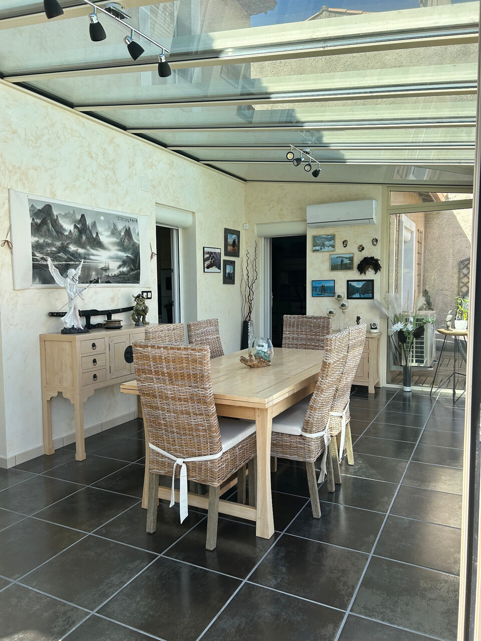 Une véranda lumineuse et conviviale, avec vue directe sur la piscine