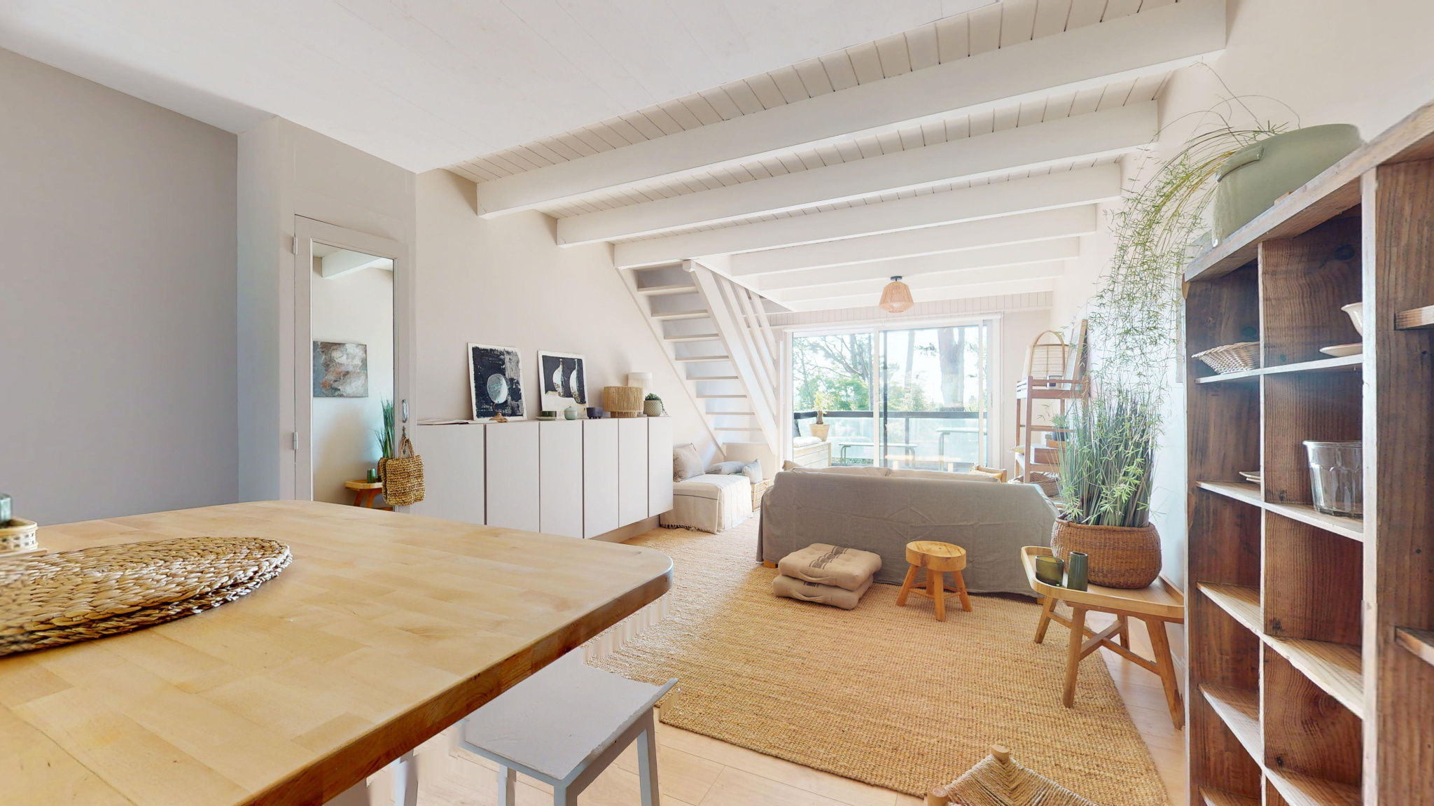 Vous trouverez une lumineuse pièce de vie composée d'une cuisine ouverte équipée et aménagée et d'un salon ouvert sur la terrasse.