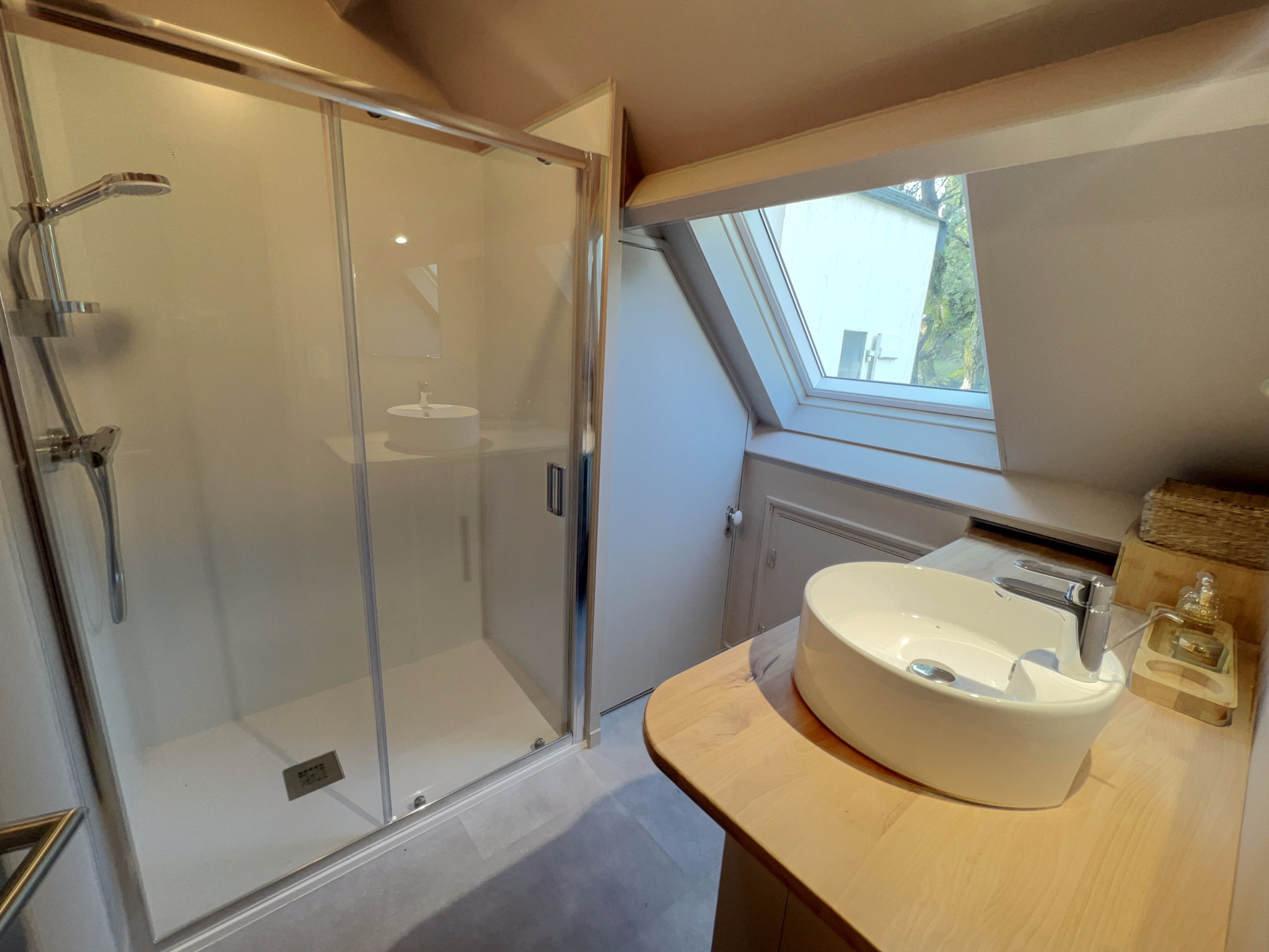 A l'étage, avec un escalier en bois clair vous trouverez une chambre et une salle d'eau (douche), tandis qu'un second escalier vous conduit à une mansarde aménagée, idéale pour une chambre d'appoint ou un bureau.