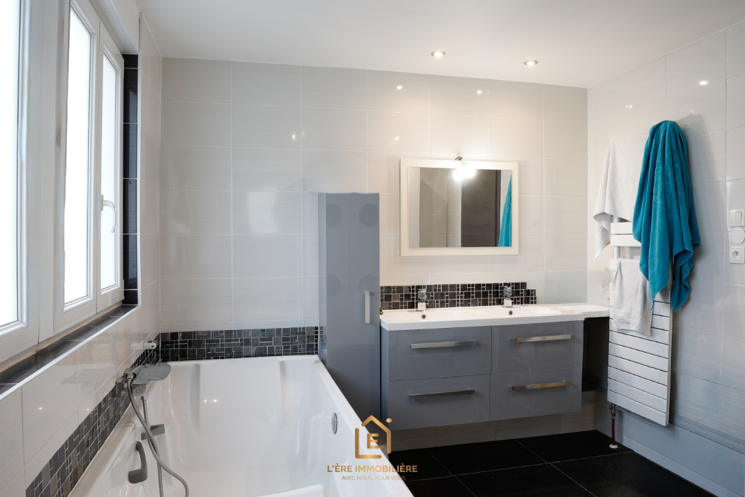 Grande salle de bain avec baignoire, douche et WC
