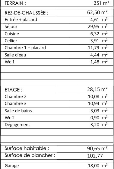 Cette maison spacieuse expo sud et ouest de 90m2 carrez et 102,77m2 utiles sur un terrain de 351m2 comprend :