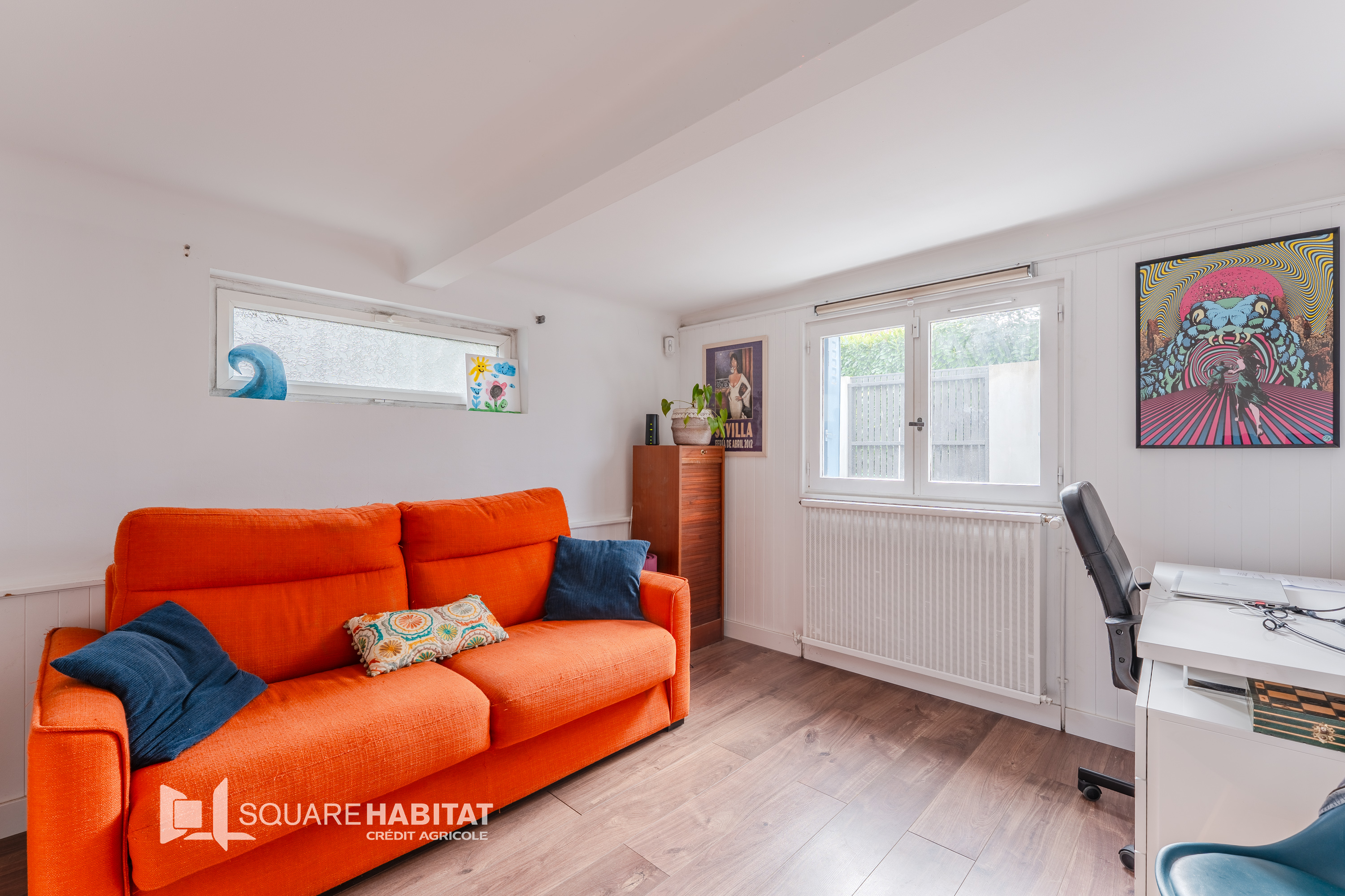 Au rez-de-jardin vous serez séduit par une pièce de vie lumineuse ouverte sur le jardin grâce à une large baie vitrée, idéale pour profiter des beaux jours. La cuisine attenante, fonctionnelle et conviviale, pourra être aménagée selon vos envies. Ce niveau comprend également une chambre, pratique pour accueillir amis, famille ou pour un usage en bureau, ainsi qu'un WC indépendant, un espace buanderie.