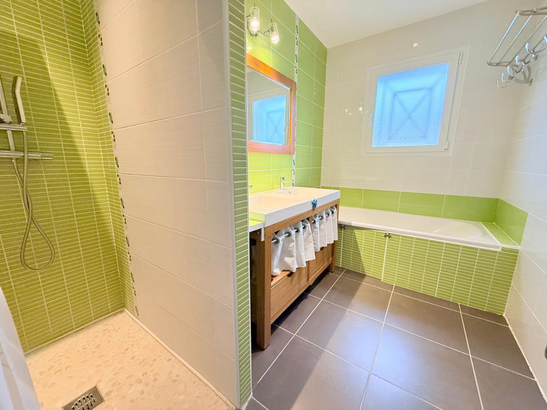 Le cellier/buanderie très pratique offre un maximum de rangements, et la salle de bain est équipée d'une douche et d'une baignoire.