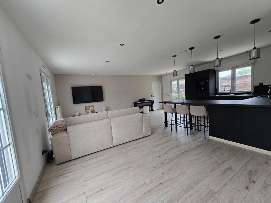 Bel espace de vie avec cuisine équipée ouverte avec son ilot central, avec portes fenêtres donnant sur le jardin.