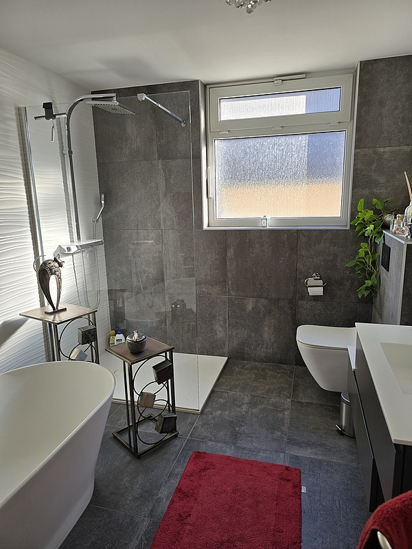 - 1 salle de bain avec baignoire, douche à l'italienne, meuble vasque et w.c