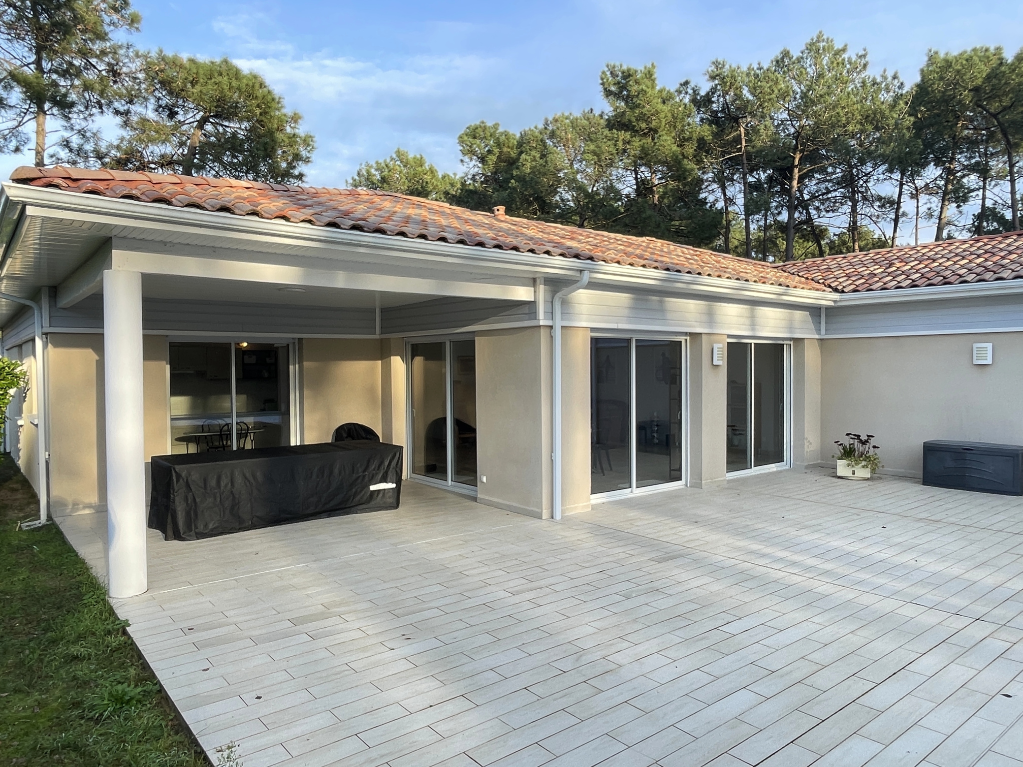 Une loggia de 15 m2 située devant la cuisine, une terrasse carrelée autour de la piscine 5/10 avec 100 m2 de terrasse
