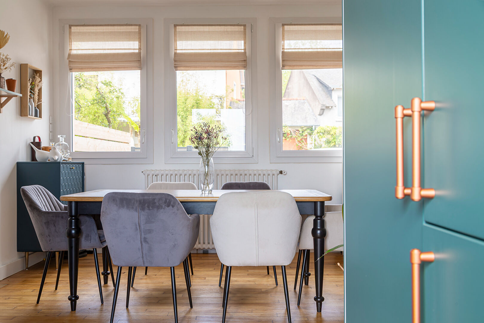 Au rez-de-chaussée, une salle à manger lumineuse s'ouvre sur une cuisine contemporaine entièrement repensée, pensée pour allier esthétique et fonctionnalité.