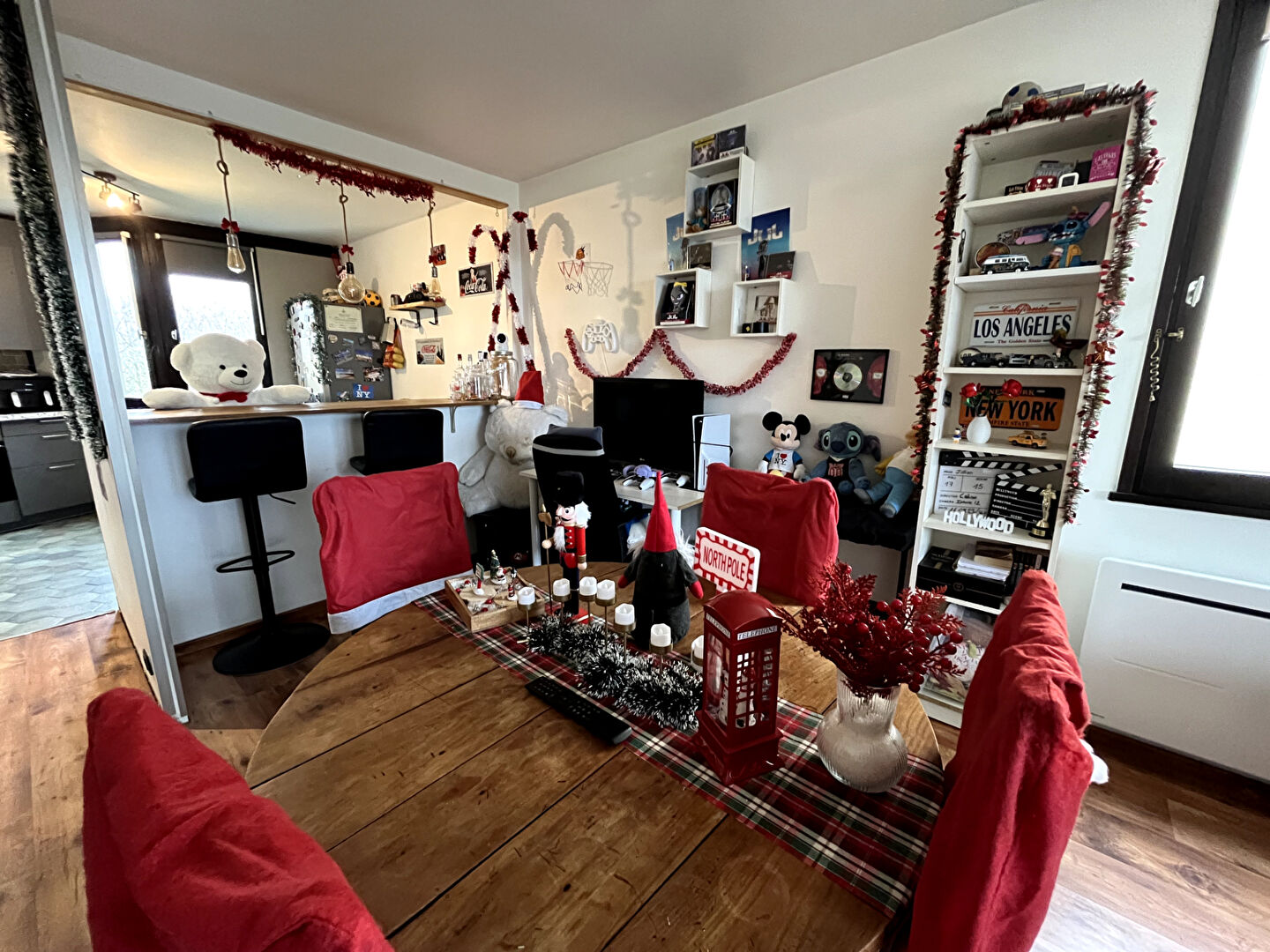 La cuisine ouverte, entièrement équipée et d'environ 10 m², s'intègre harmonieusement au séjour grâce à son bar convivial, créant une pièce de vie spacieuse et chaleureuse.