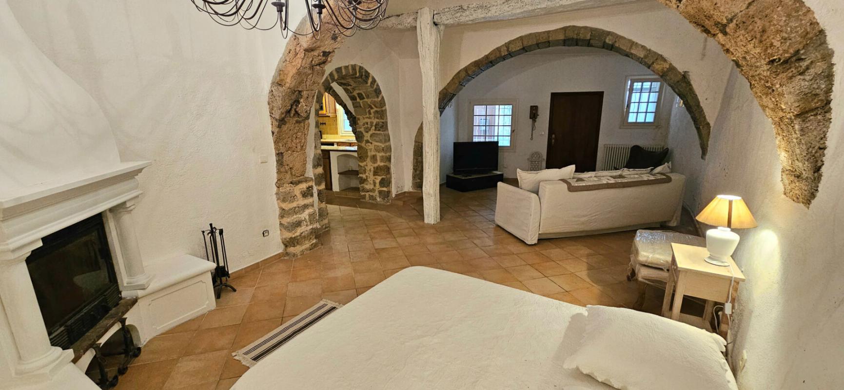 En rez de rue, un vaste espace vouté, en pierres avec une cuisine, un coin nuit et une salle de douche avec WC .