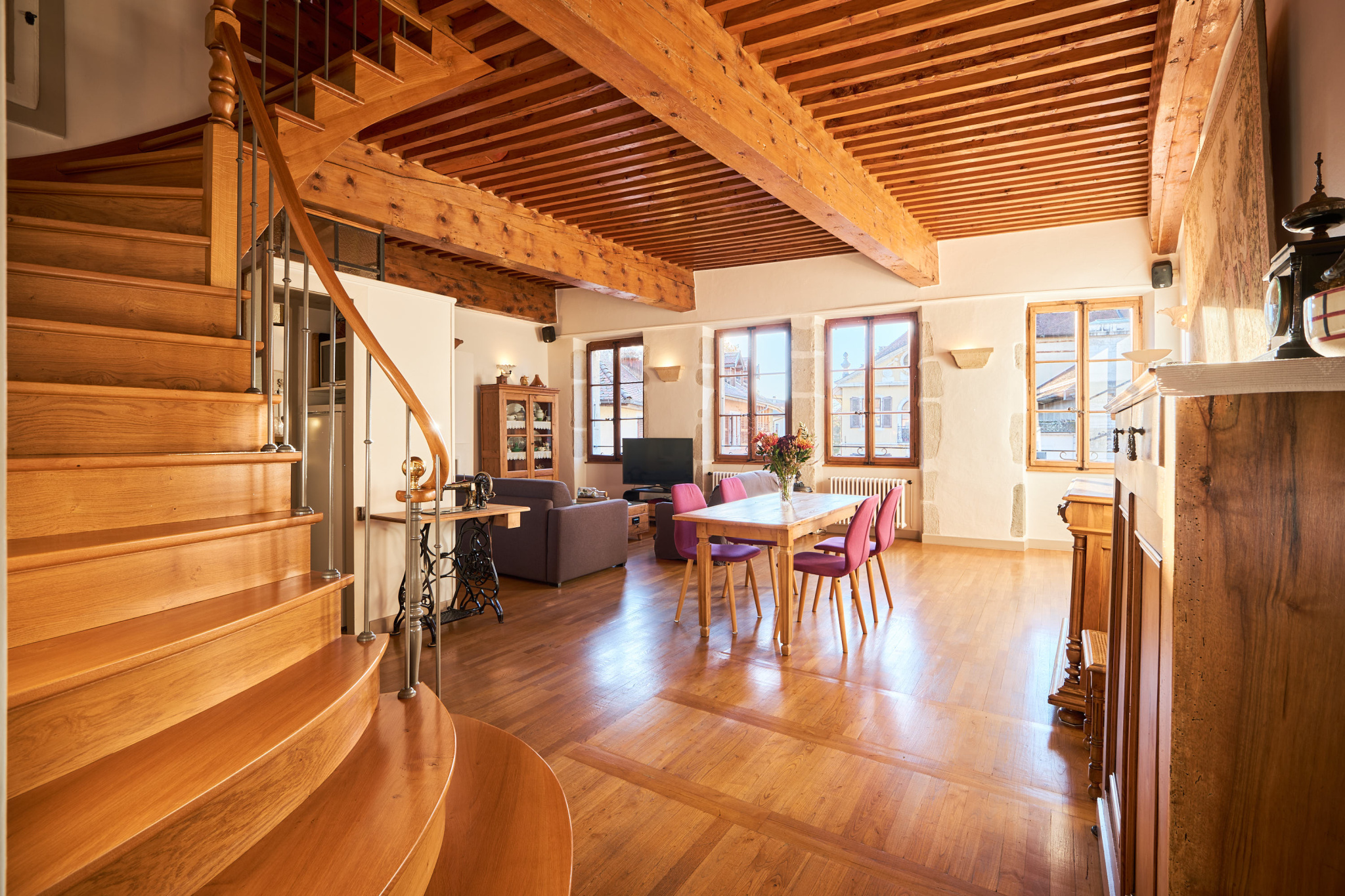 Le salon actuel, de plus de 40 m2, offre une vue époustouflante sur le canal du Thiou, l'ancienne mairie d'Annecy et la cathédrale, à travers d'authentiques huisseries en chêne massif. Une cheminée avec insert est fonctionnelle et régulièrement entretenue pour de chaleureuses flambées hivernales. La cuisine semi-ouverte est séparée par un bar et une verrière en fer forgé. Enfin, vous apprécierez dans cette pièce le travail des Compagnons du Tour de France sur l'escalier en chêne massif qui mène à l'étage supérieur.