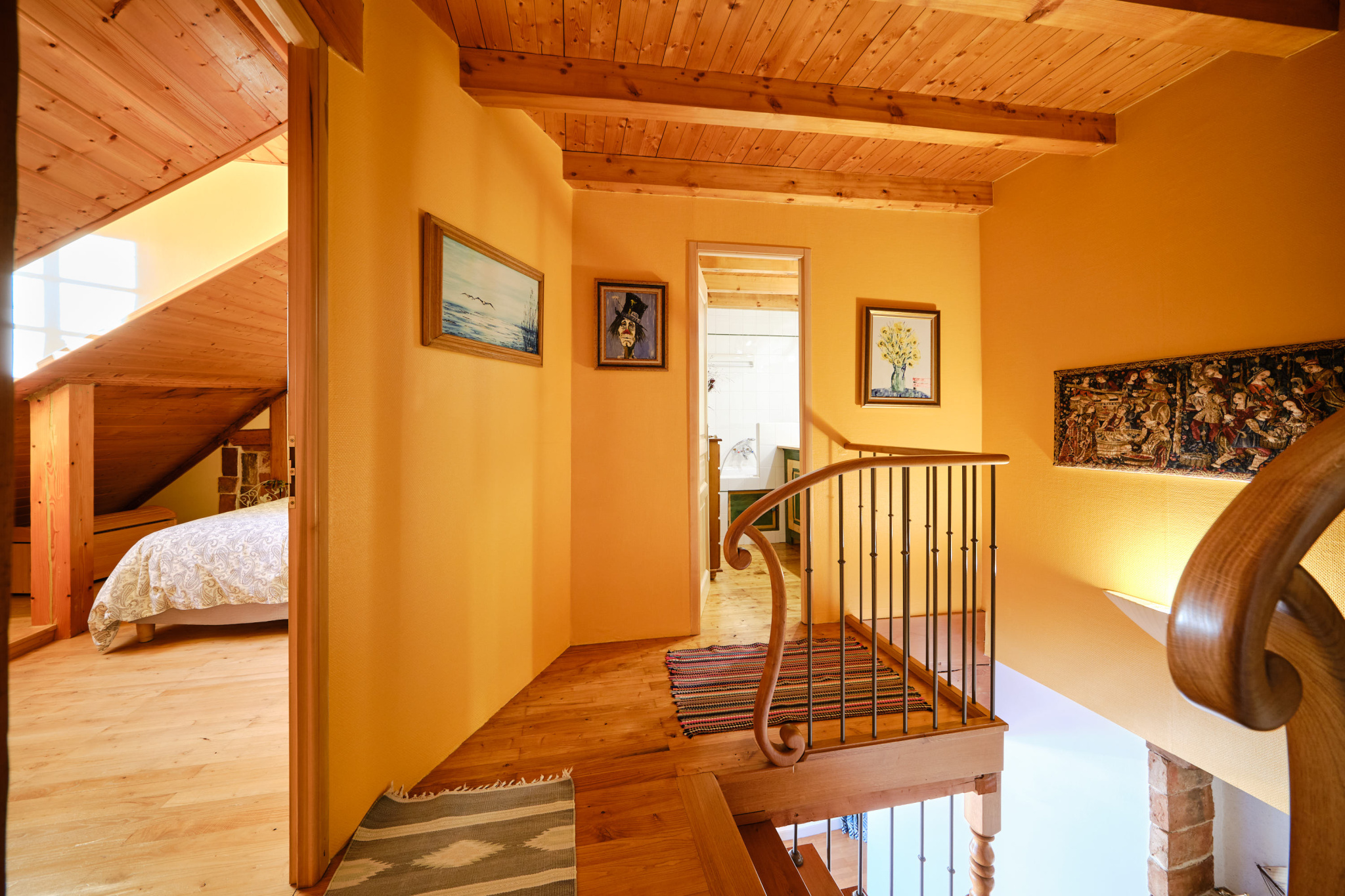 Au premier niveau se trouvent la chambre parentale, la salle de bains, un espace bureau ainsi qu'une mezzanine faisant office de chambre.