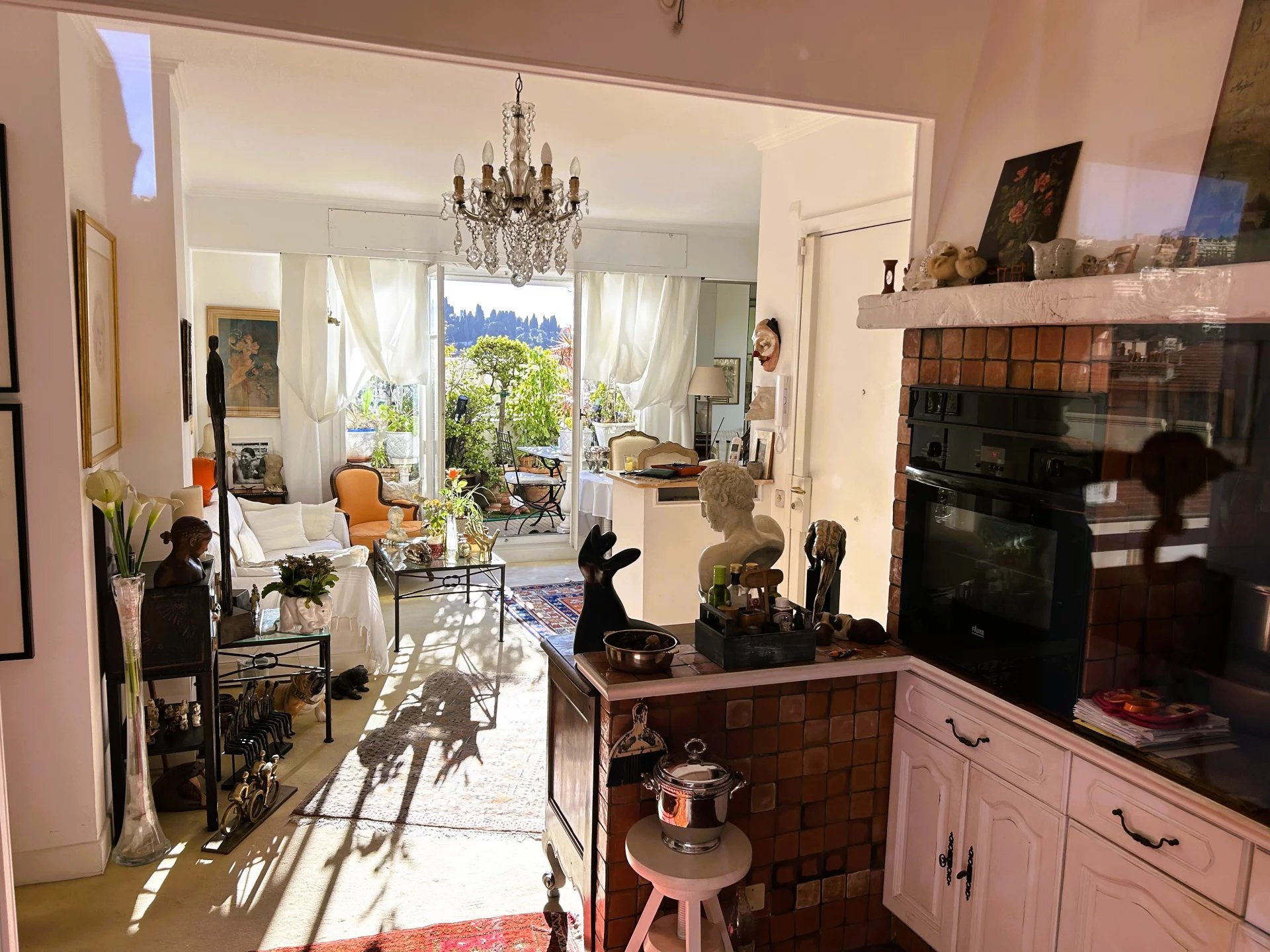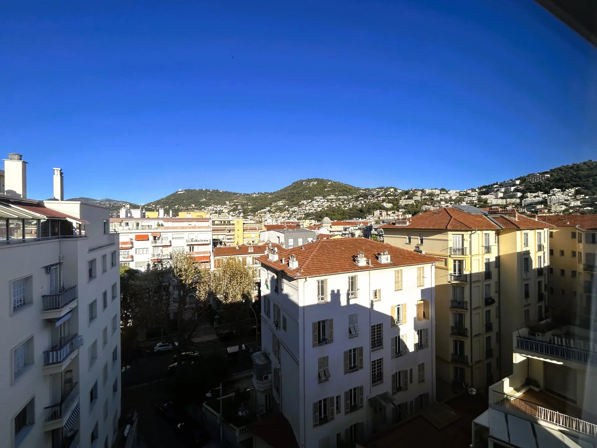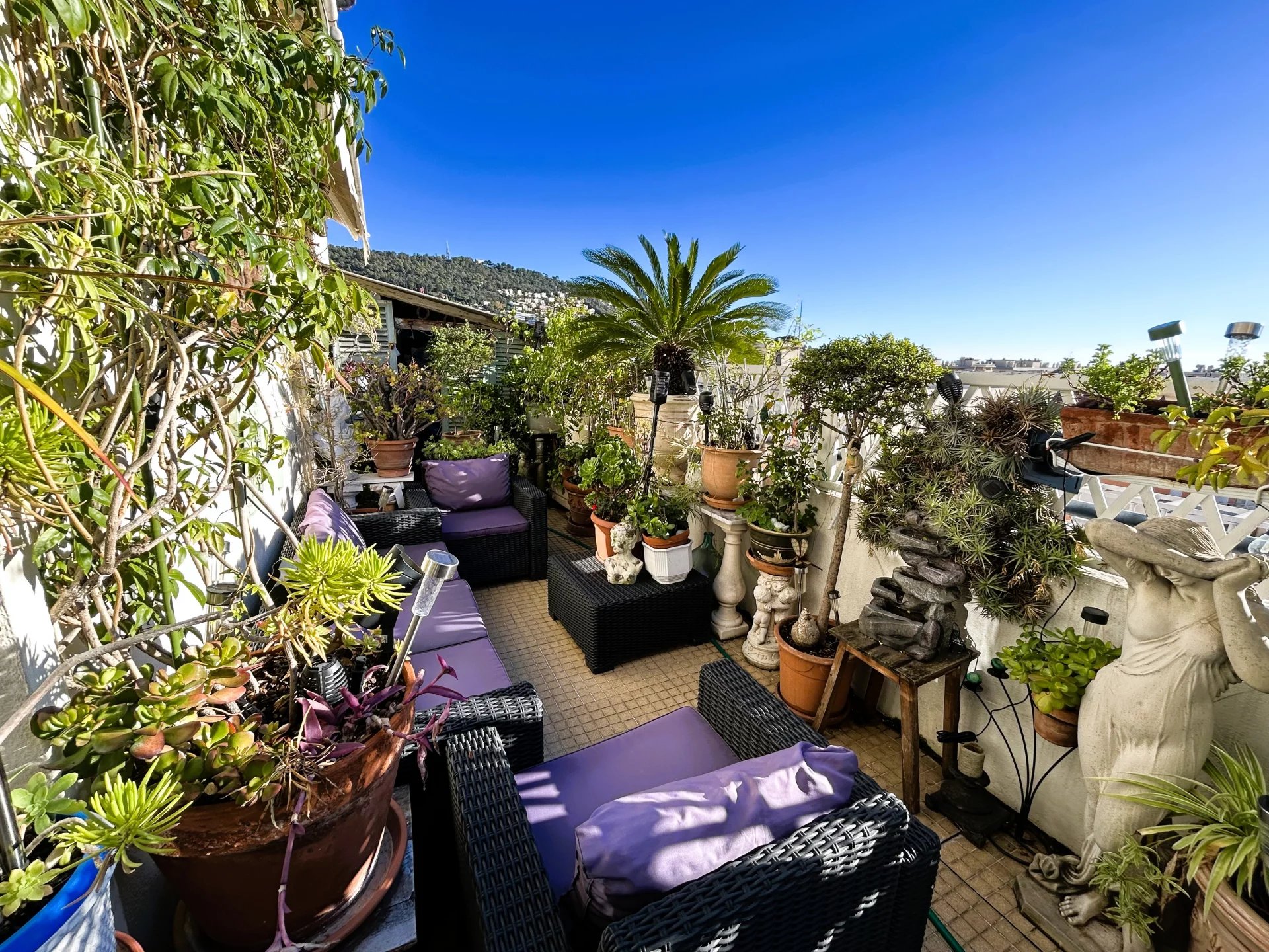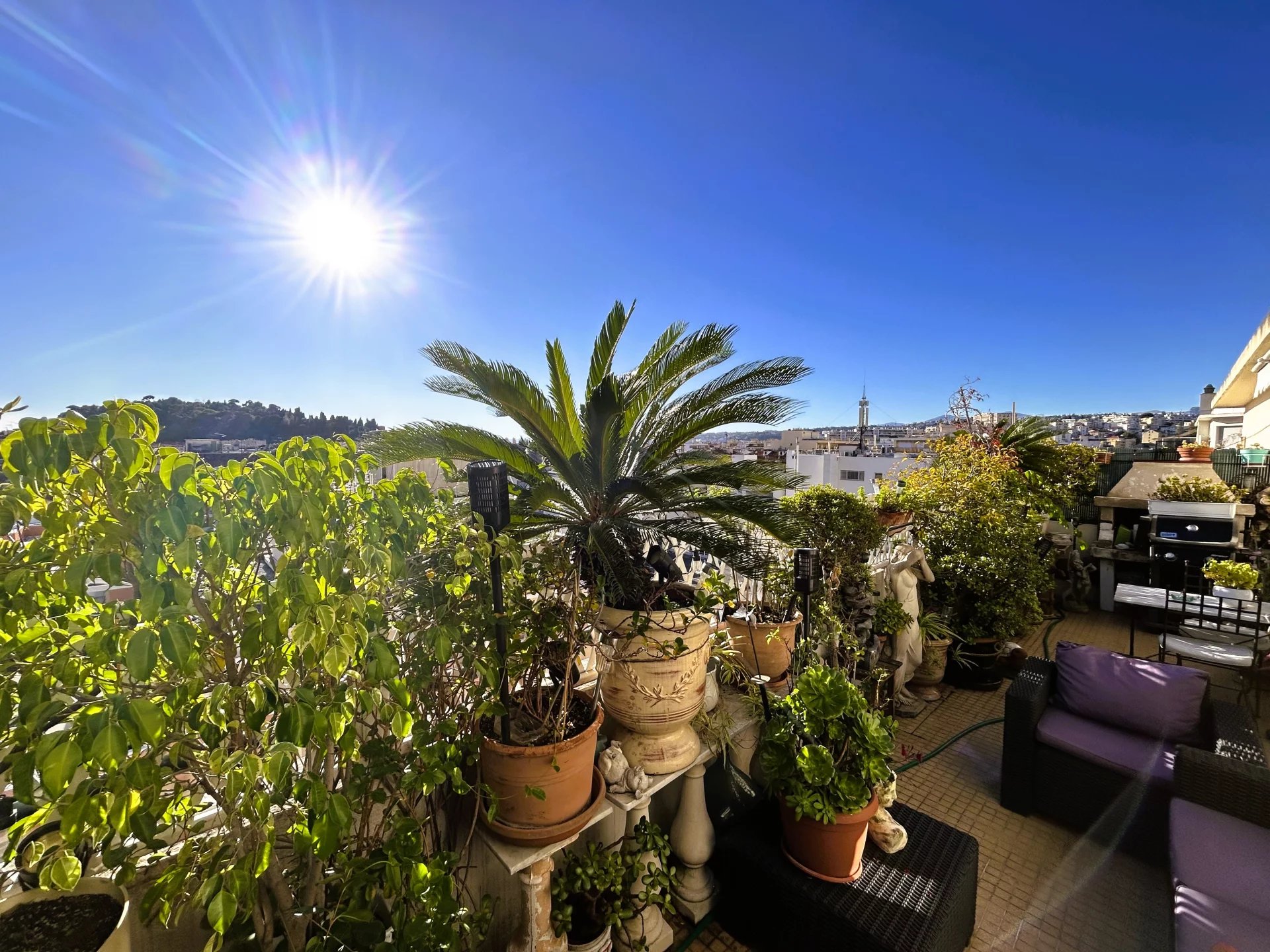 Sans vis à vis et au calme, cet appartement lumineux et traversant séduit par sa splendide terrasse de 26 m², exposée plein sud, totalement à ciel ouvert, et offrant une vue panoramique sur les toits de la ville et les collines niçoises.