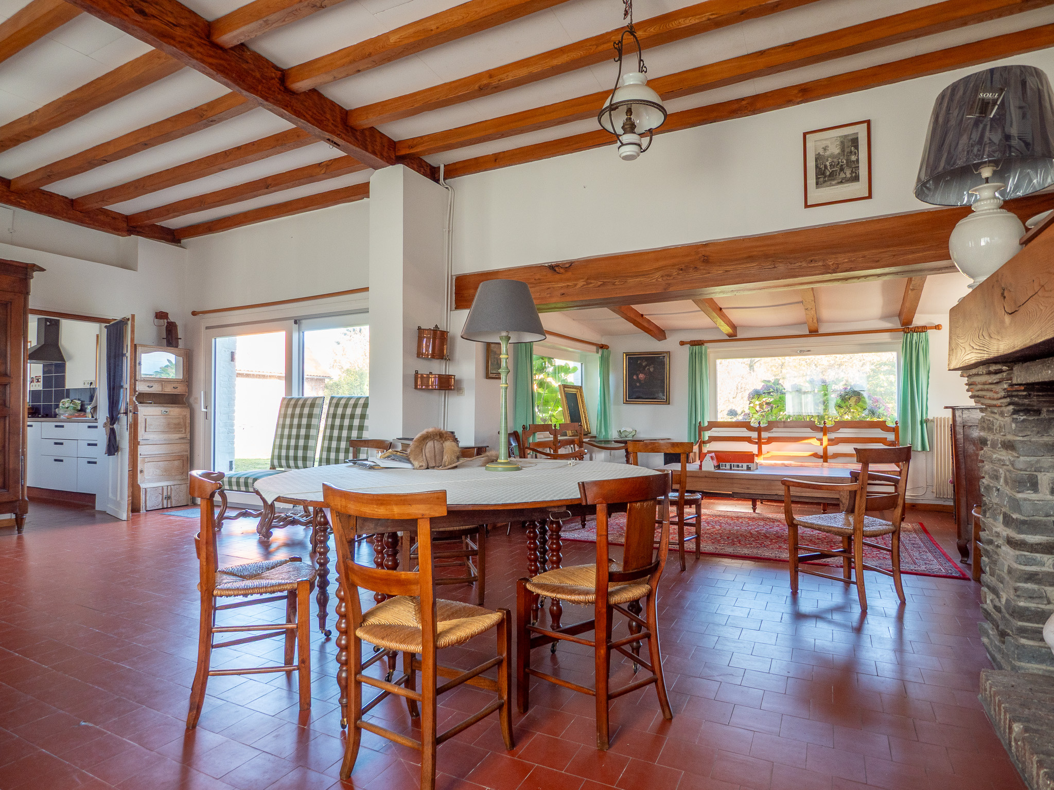 Le hall d'entrée dessert un vaste salon avec cheminée feu de bois, une cuisine équipée avec coin repas, ainsi qu'un second salon cosy agrémenté d'un poêle à pellets. Deux chambres et une salle de bain se trouvent également au rez-de-chaussée, permettant une vie de plain-pied.
