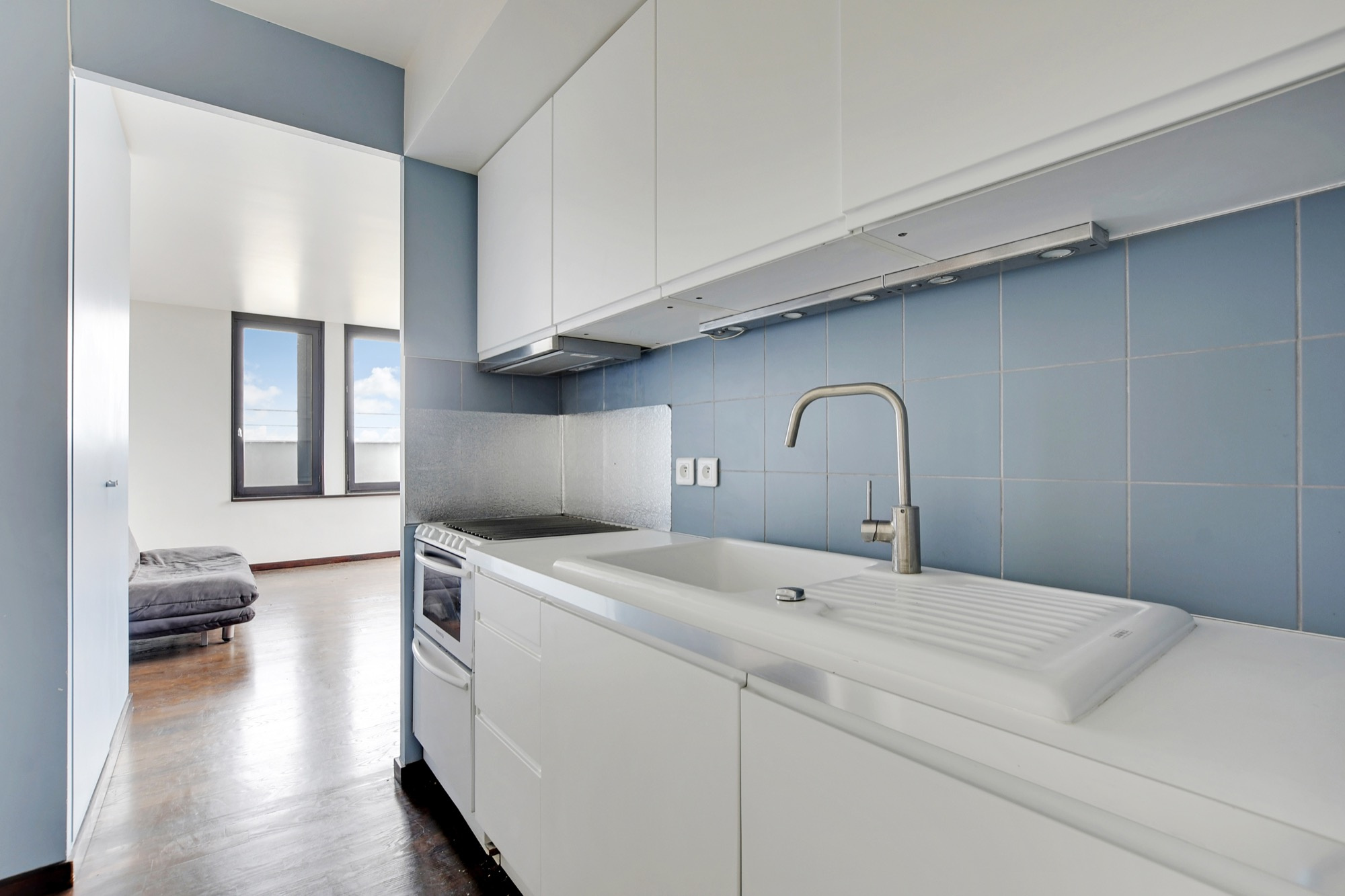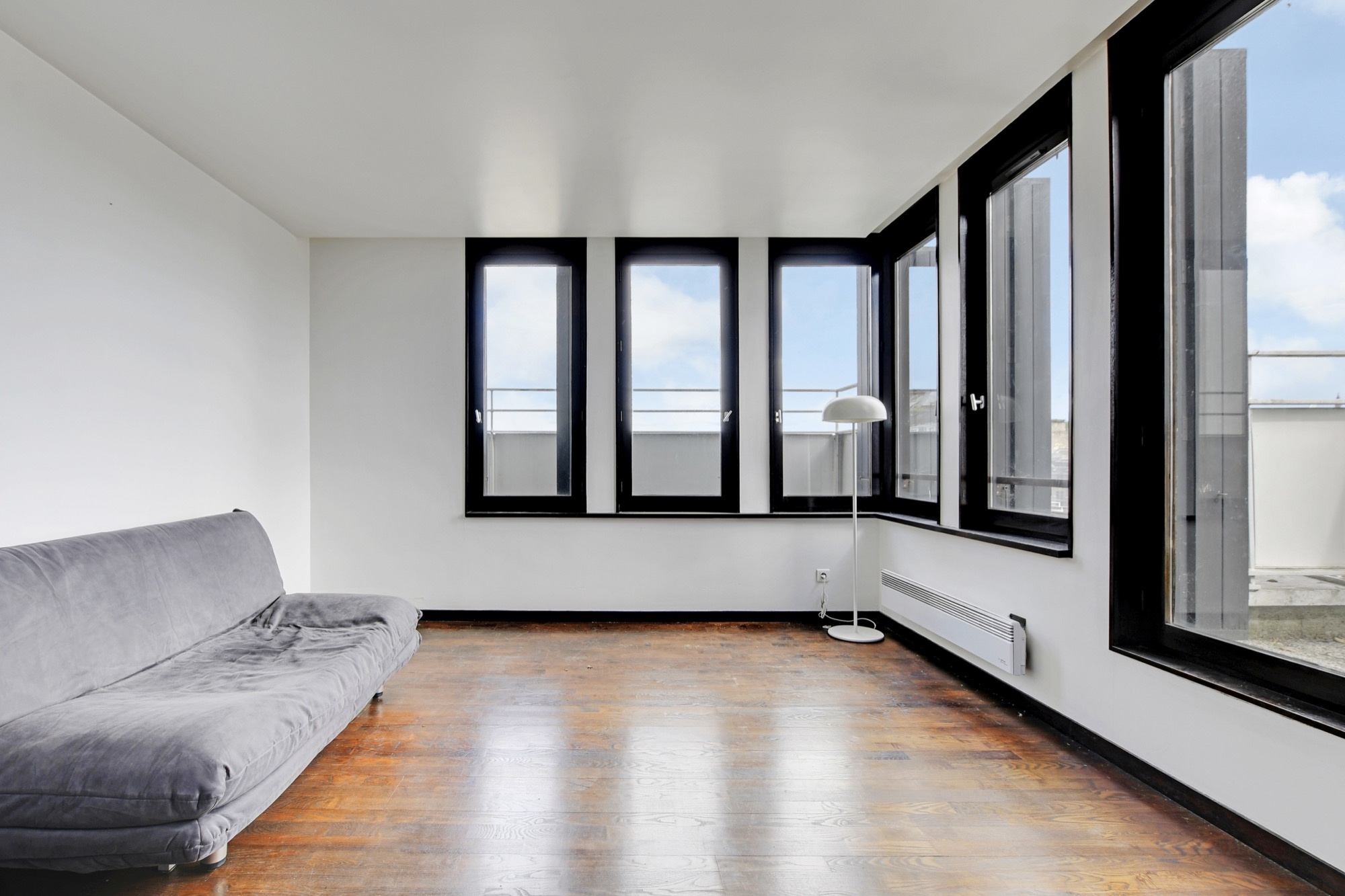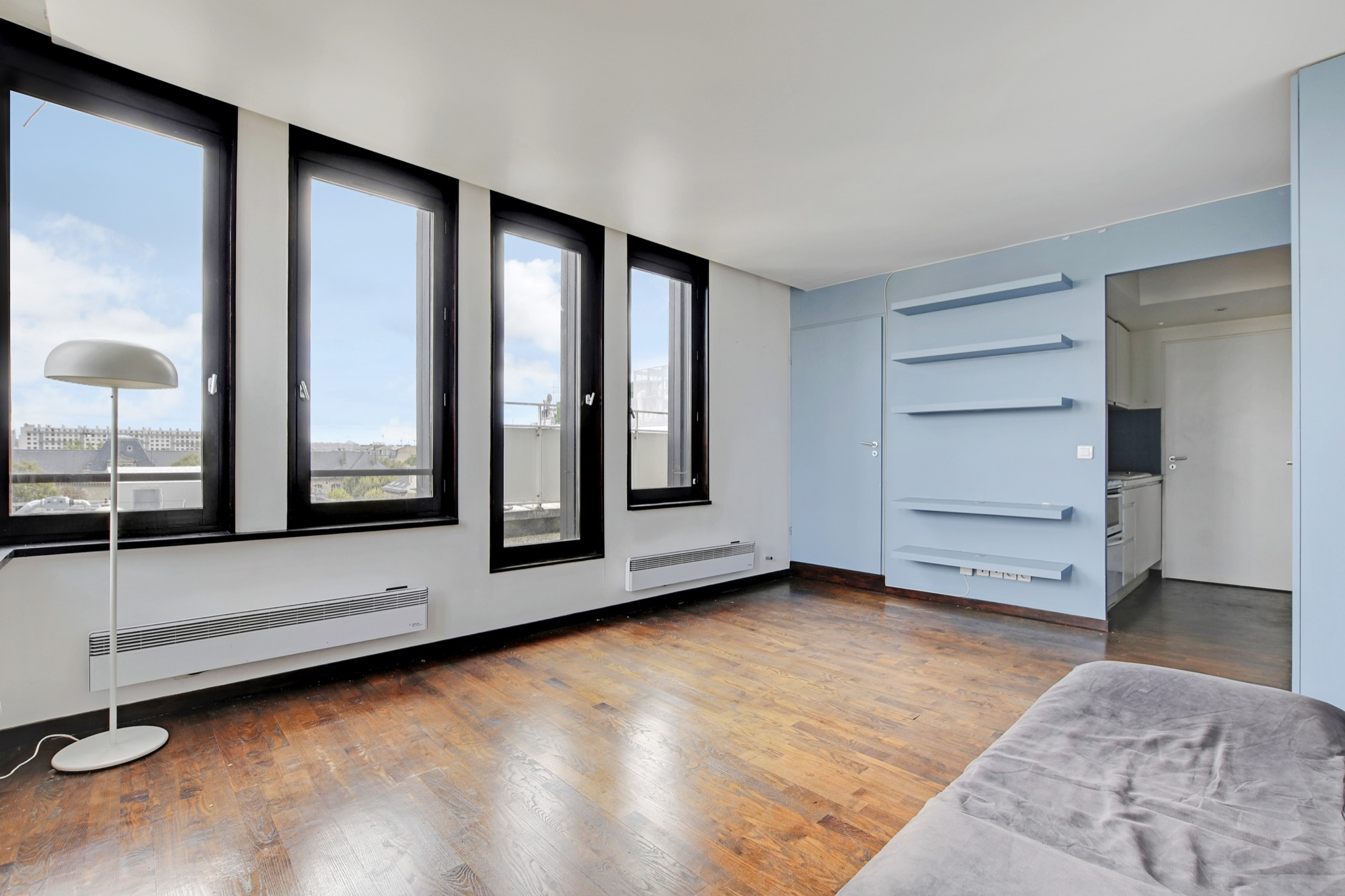 Situé au 7ème et dernier étage d'un immeuble sécurisé avec digicodes, interphone, ascenseur, le STUDIO a été conçu par un architecte permettant énormément de rangements, une cuisine entièrement équipée (four, lave vaisselle...), une salle de bains avec baignoire, et une pièce principale avec 7 fenêtres.