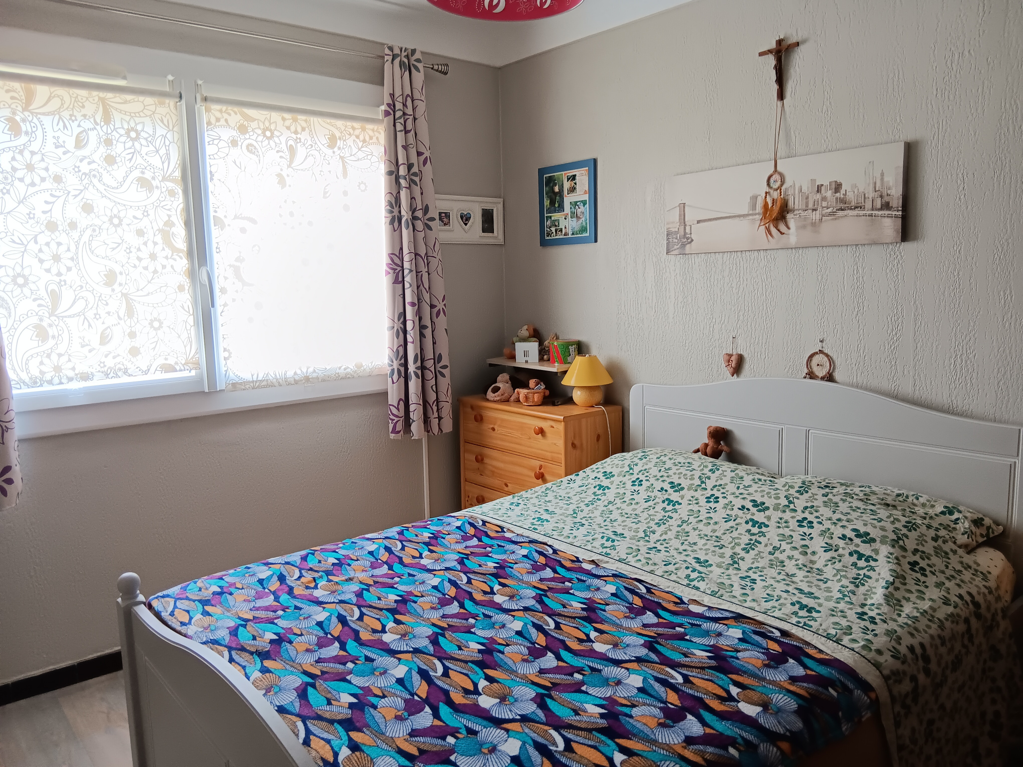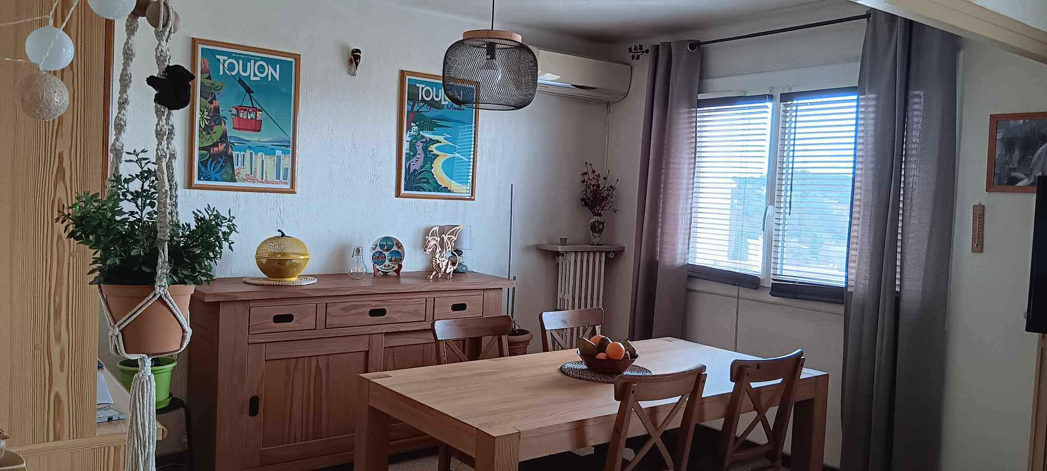Le salon/séjour est équipé d'une clim réversible en plus du chauffage collectif. Double vitrage, volet roulants.