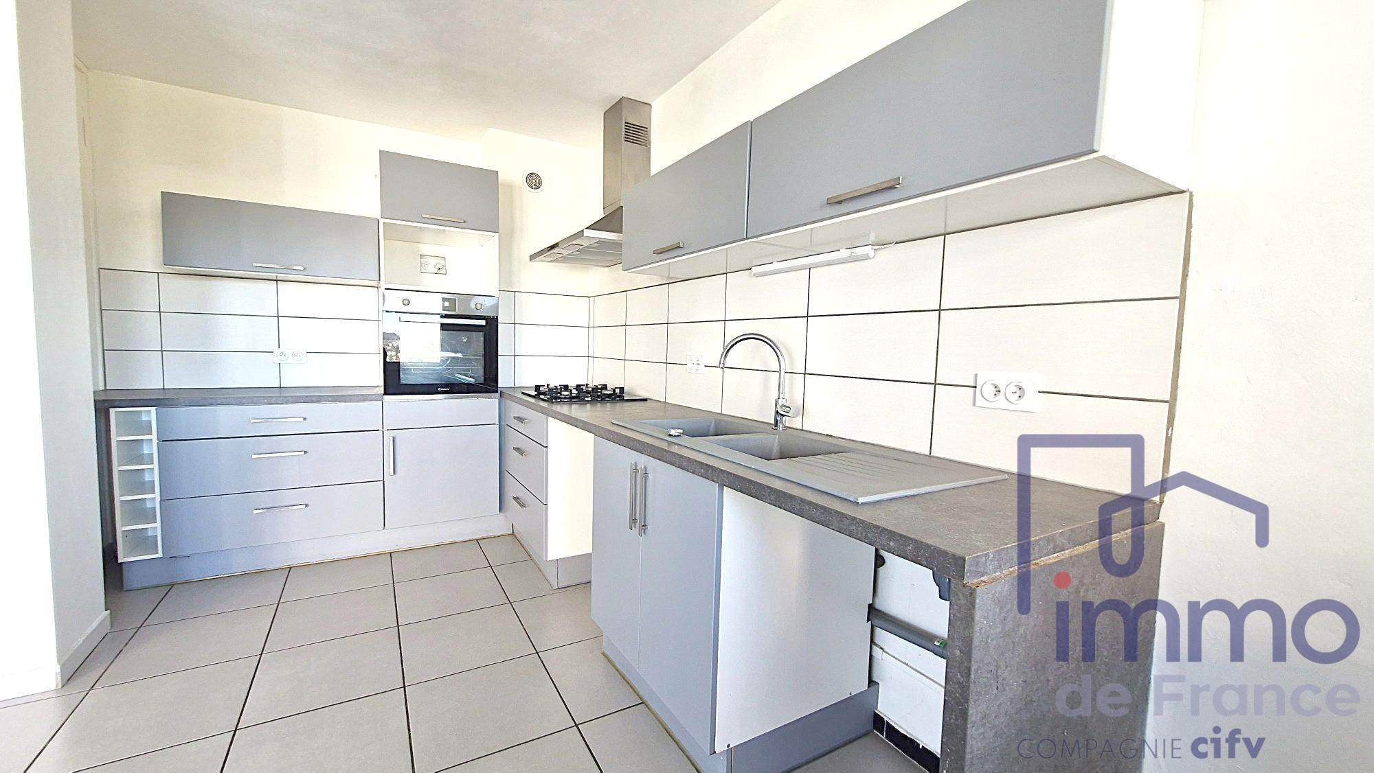 Pièce de vie spacieuse avec cuisine meublée et équipée, ouverte sur le séjour, et loggia attenante.