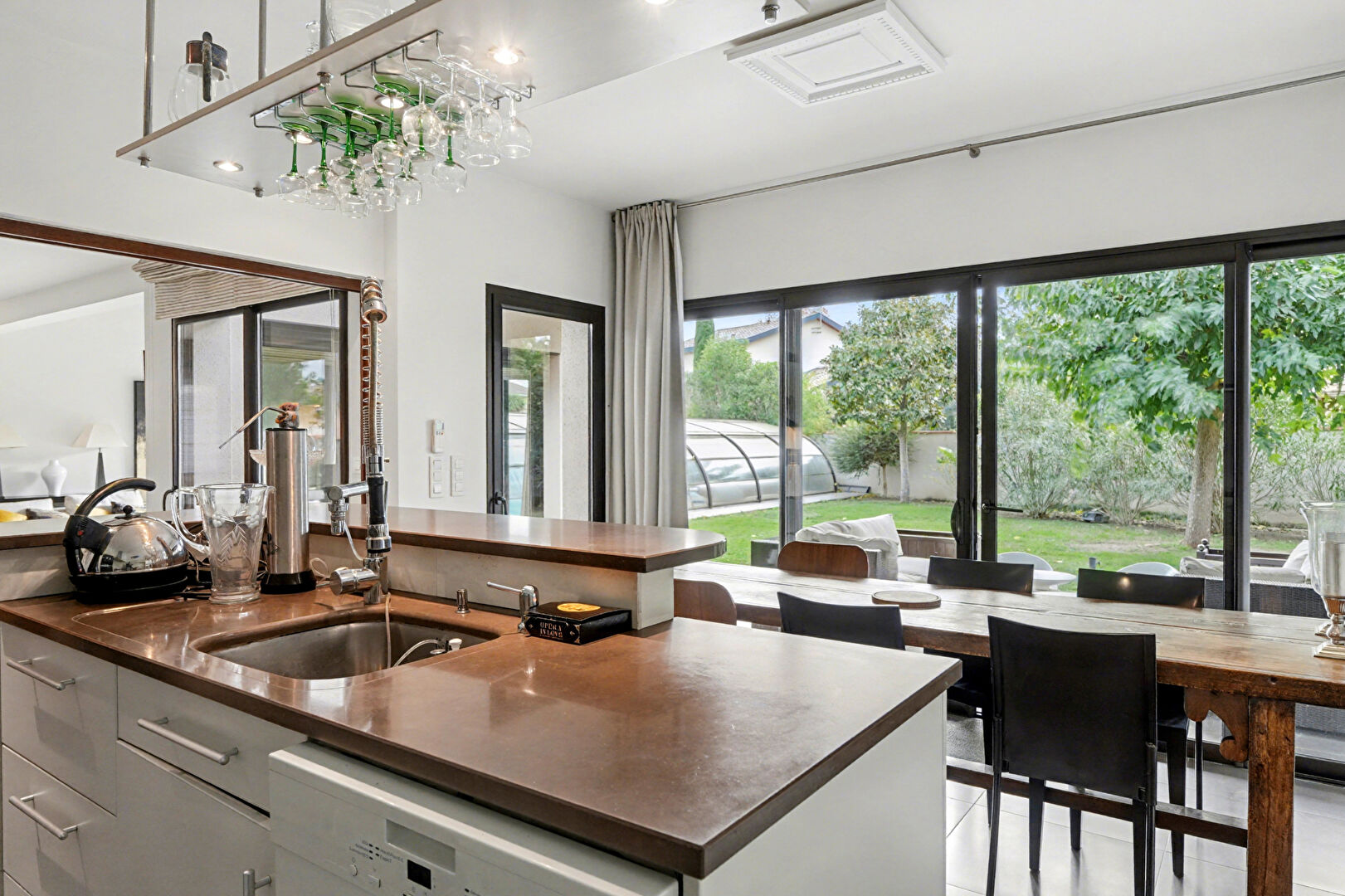 Pensée presque entièrement de plain-pied, elle séduit par ses volumes généreux, sa circulation fluide et une luminosité omniprésente. Le vaste séjour de plus de 50 m² s'ouvre largement sur l'extérieur et permet de profiter pleinement du jardin et des espaces de détente. La cuisine familiale, conviviale et tournée vers le jardin, s'impose naturellement comme la pièce de vie centrale de la maison.