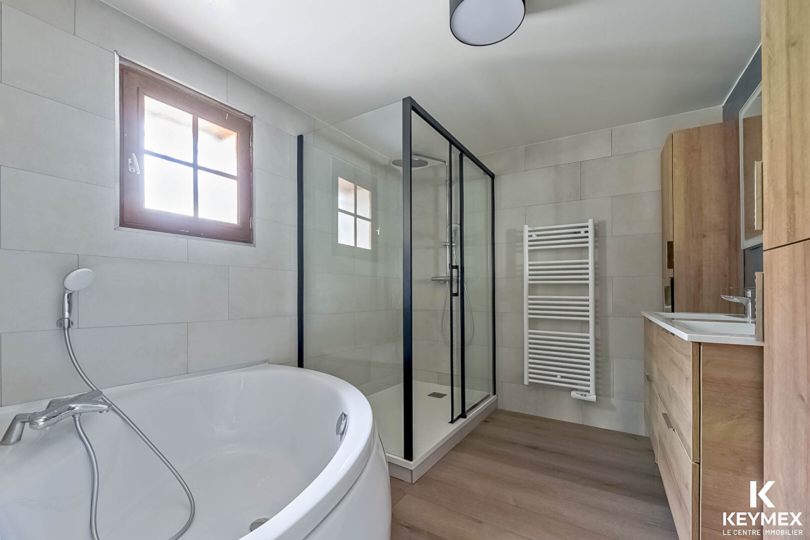Le rez-de-chaussée offre un bel espace de vie traversant, composé d'un séjour double avec véranda intégrée, d'une cuisine moderne et conviviale, ainsi que d'une chambre de plain-pied avec sa salle d'eau privative, un vrai plus pour recevoir ou vivre de plain-pied. Un WC séparé complète ce niveau.