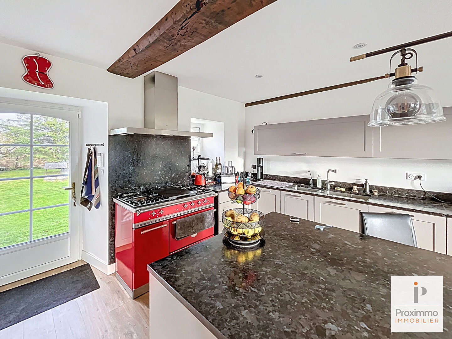 Le hall d'entrée dessert également à gauche, une superbe cuisine contemporaine, avec cheminée d'époque, organisée autour d'une table d'hôtes qui ravira vos soirées gourmandes en famille ou entre amis : Convivialité assurée !