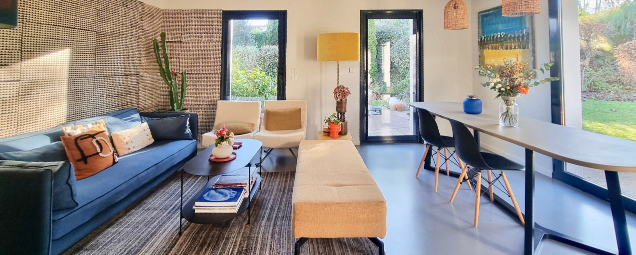- À l'étage : vaste pièce de vie de 36 m² ouverte sur terrasse et jardin, 3 chambres dont une suite parentale, mezzanine, 2 salles d'eau, 2 WC, bureaux
