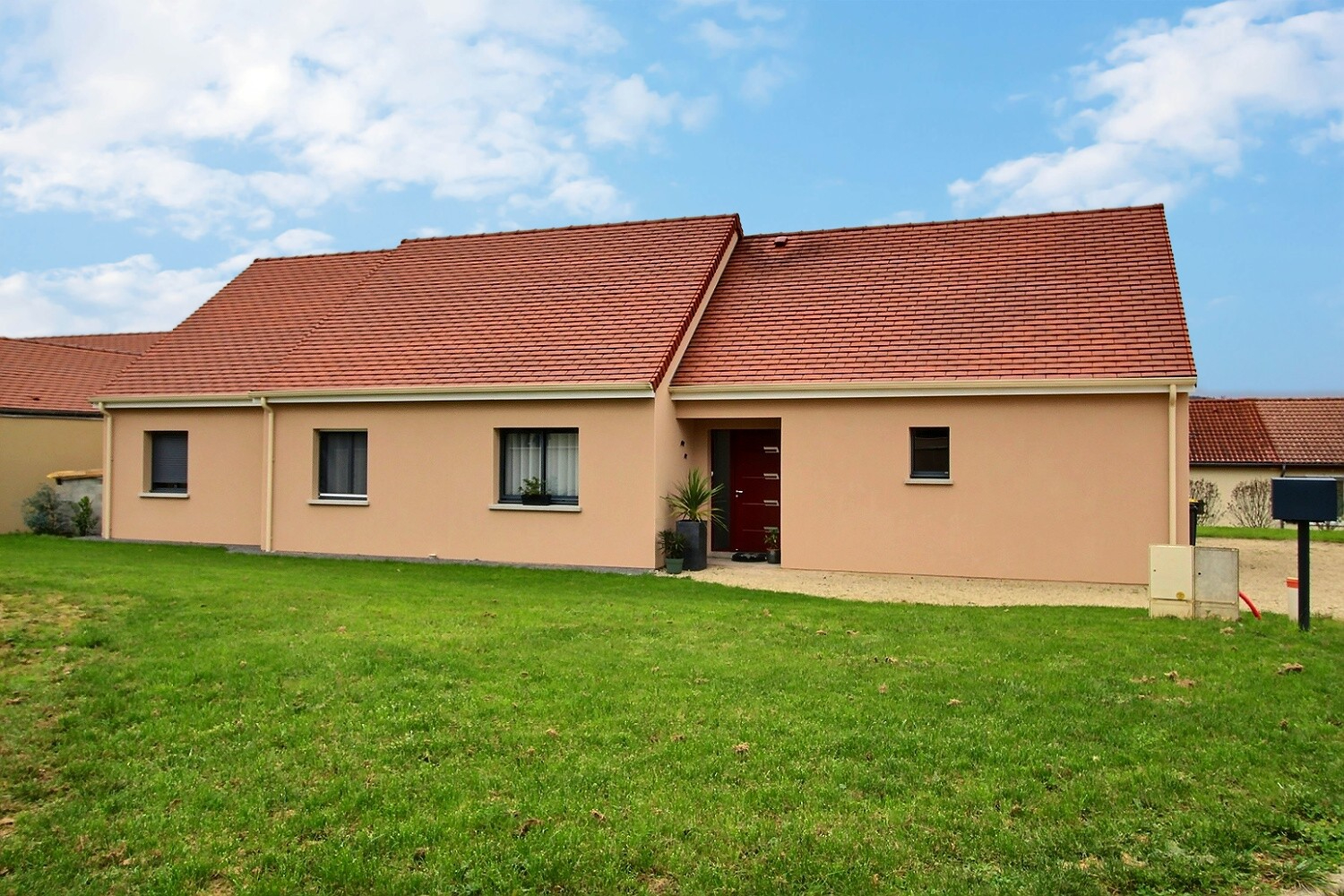 Coeur de village, dans lotissement récent, maison individuelle de plain-pied de 115 m² habitable offrant: entrée sur dégagement, cuisine ouverte sur séjour avec accès terrasse extérieure, salon sur baie vitrée avec bureau/dégagement, trois chambres dont une parentale avec salle d'eau privative et toilettes, une deuxième salle d'eau et wc indépendant. Garage attenant avec accès depuis la maison. Cellier avec buanderie et chaufferie.
