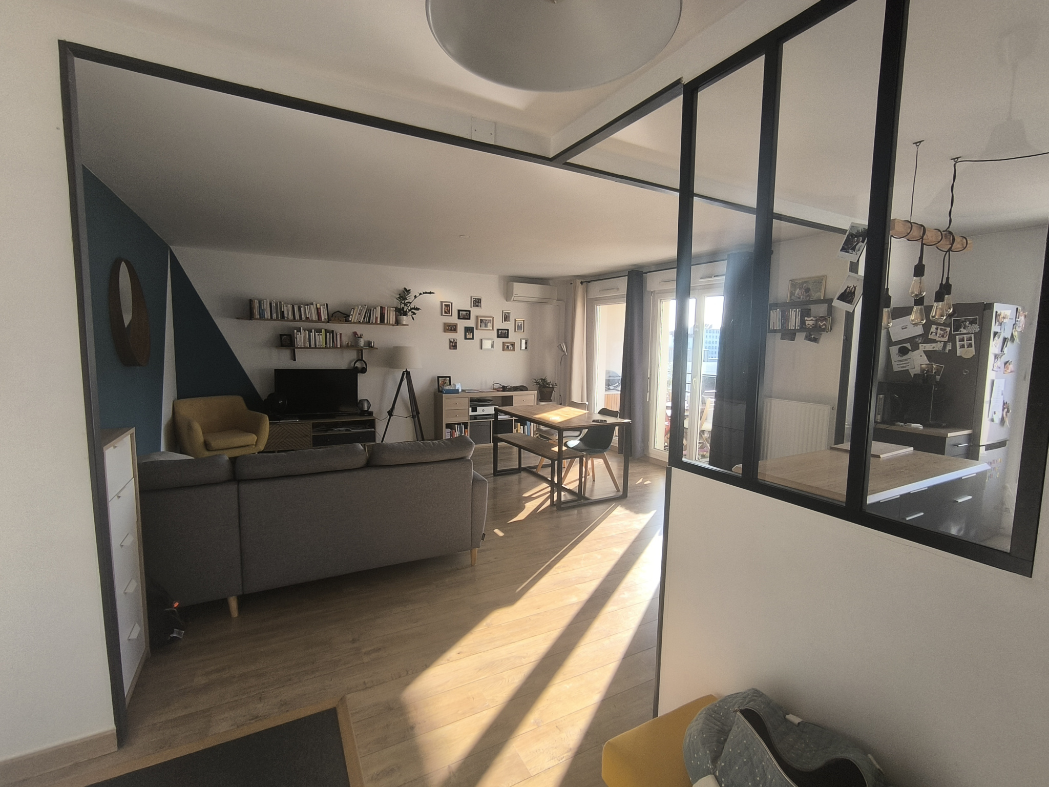 L'entrée, mise en valeur par une verrière élégante, ouvre sur une grande pièce de vie de 40 m2 avec cuisine américaine et séjour lumineux donnant accès à un balcon de 8,5 m2, idéal pour profiter de l'extérieur.