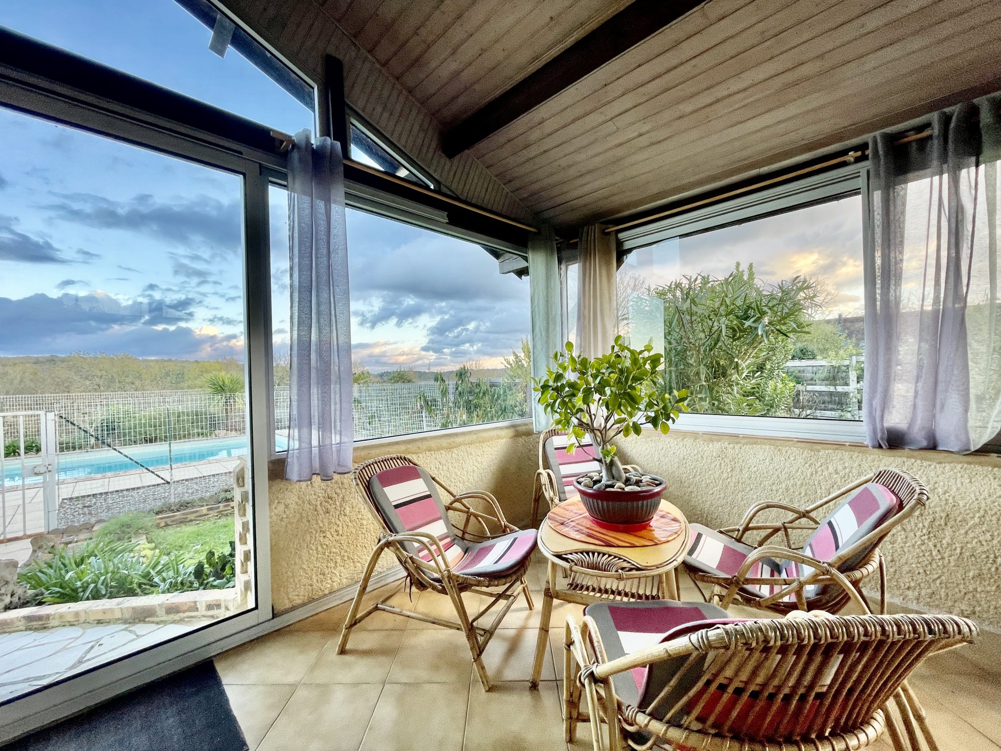 Emplacement exceptionnelle sur hauteurs, vue sur les champs et les bois, 3 chambres dans 1 au RDC, 2 salles de bains , 3 wc, Veranda. Dependances dont une buanderie avec un garage isolée, un carport, un attelier technique, une cuisinette de jardin avec un BBQ, , piscine 5x9, atelier , jardin fleurie avec un verger mature et clos de 5500 m2. Double vitrage, isolation mures et toiture, chauffage; poêlé Yotul et une clim reversible ....le tout en très bon etat. A VOIRE !