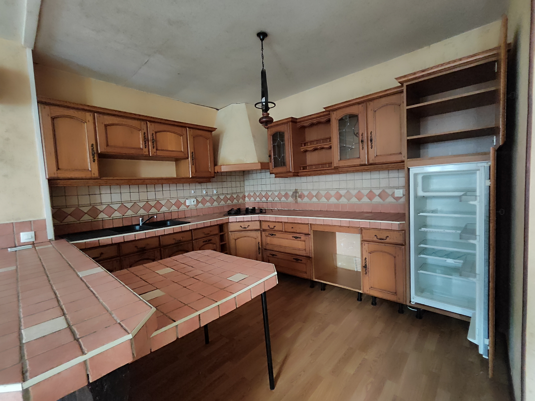 Une cuisine ouverte donnant sur un séjour lumineux, un WC indépendant