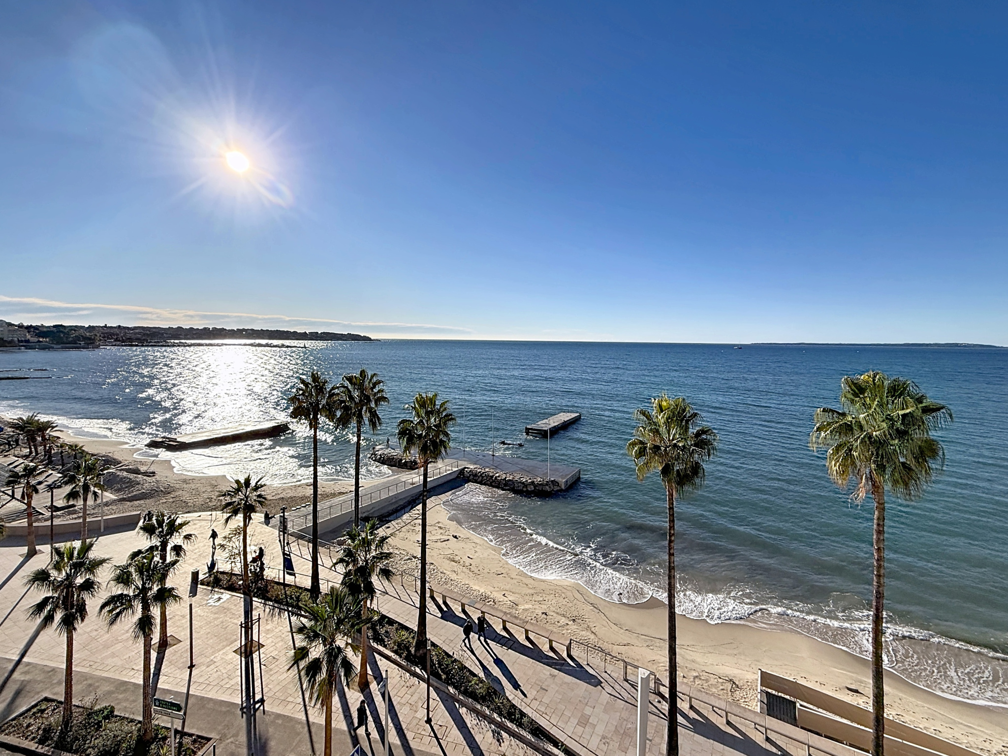 JUAN LES PINS - FRONT DE MER - Idéalement situé sur le front de mer de Juan-les-Pins, en étage élevé d'une résidence prisée, cet appartement 2 pièces séduit par son élégance, sa luminosité et sa vue mer spectaculaire. L'entrée s'ouvre sur un vaste séjour de 21 m2, baigné de lumière, prolongé par une terrasse plein sud de 15 m2 offrant un panorama à couper le souffle sur la Méditerranée. Une cuisine indépendante, une chambre spacieuse, une salle de bains (à rafraichir) équipée d'une baignoire et d'une douche, ainsi qu'un toilettes séparé complètent l'ensemble. Partiellement rénové avec des prestations de qualité, le bien bénéficie d'une climatisation gainable et d'un excellent confort. Une cave en sous-sol vient parfaire ce bien d'exception. À deux pas des plages, commerces et transports, cette adresse rare conjugue emplacement prestigieux et art de vivre azuréen. Soumis au régime de copropriété. Charges annuelles : 1888EUR. Honoraires charge acquéreur.