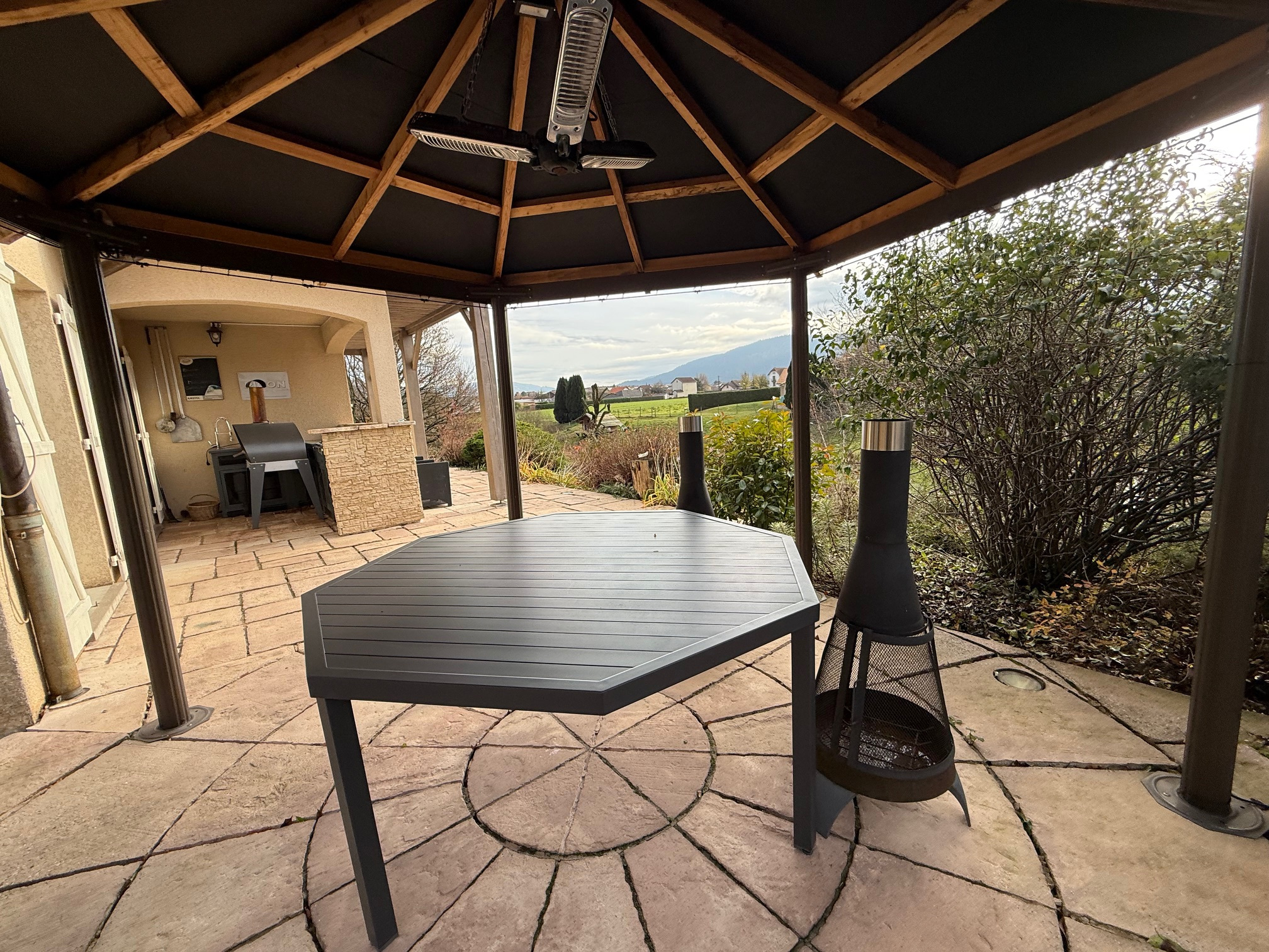 En extérieur : une tonnelle + cuisine d'été couverte avec espace bar (vendu avec plancha et brasero). PISCINE Magiline chauffée d'une dimension de 8*4. JACUZZI.