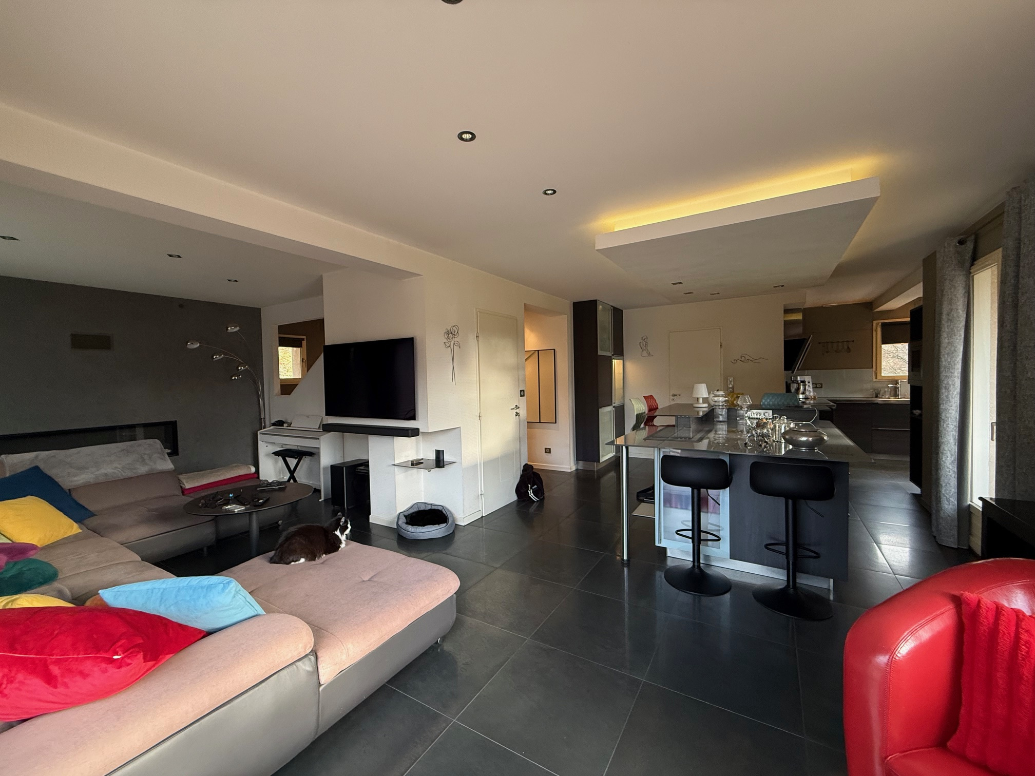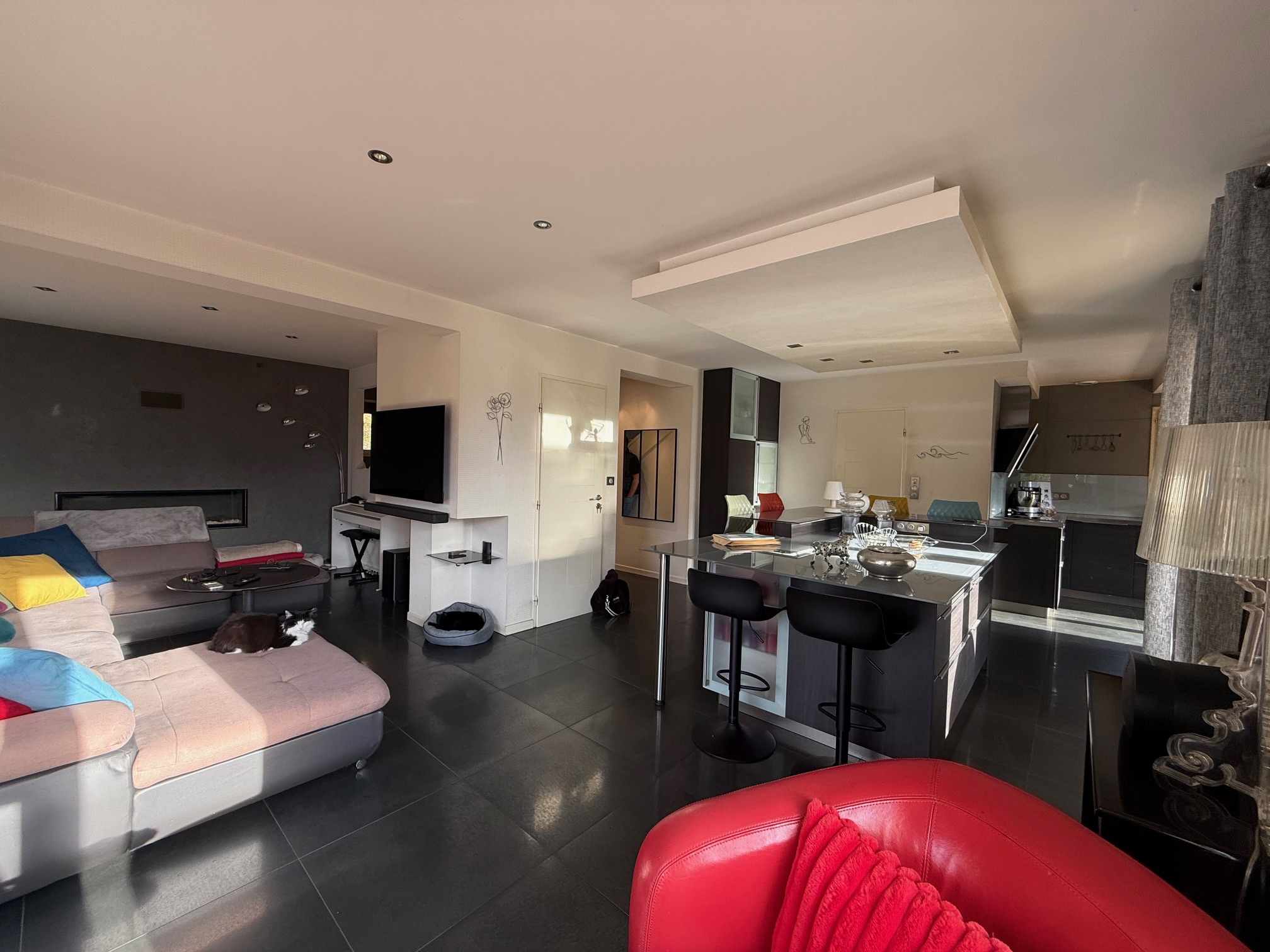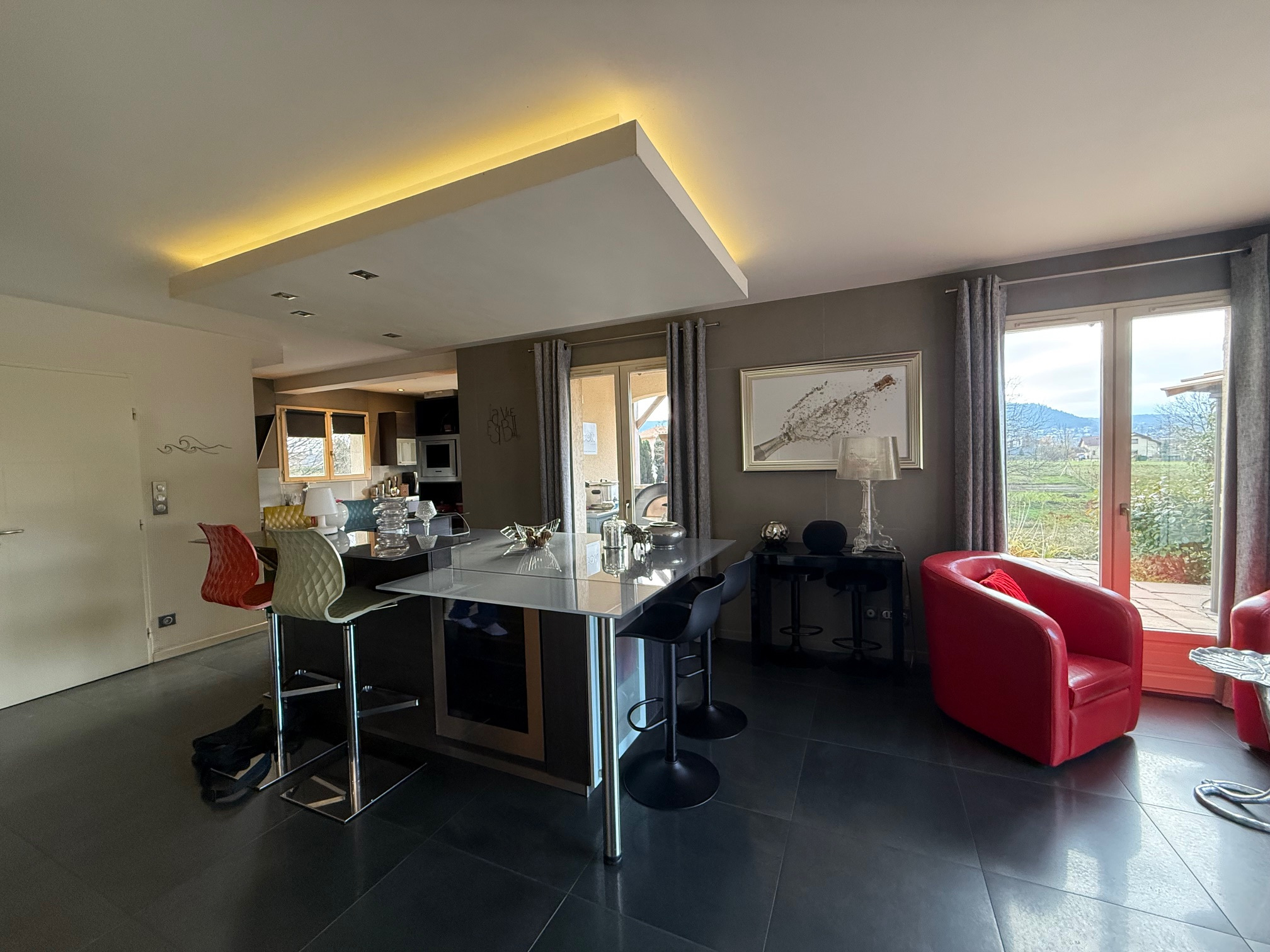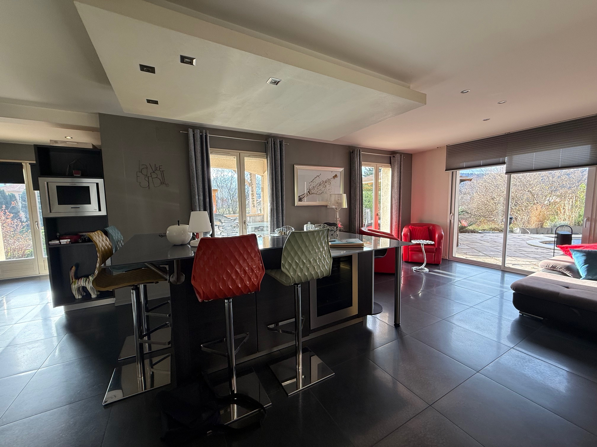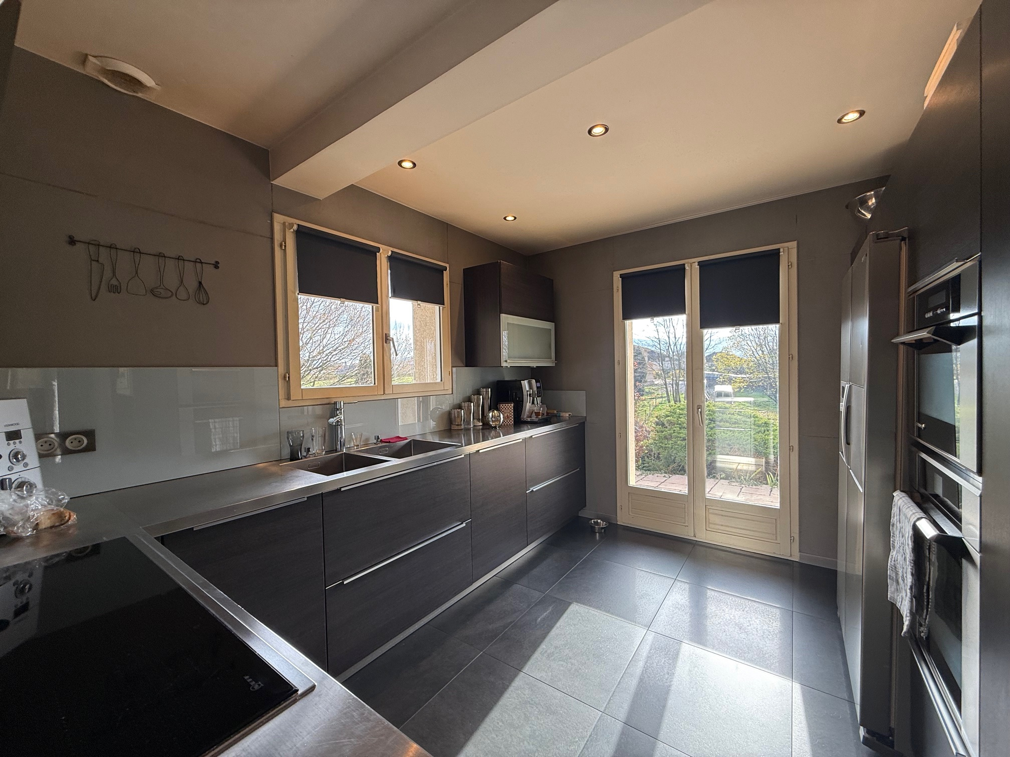 Au rez-de-chaussée : entrée dégagement, grand placard, espace bureau, cuisine équipée intégrée (vendue avec grande table et chaises bar, frigo américain...) ouverte sur salon séjour avec cheminée accès terrasse/piscine et cuisine d'été. WC, salle de douche (douche italienne, 2 vasques).