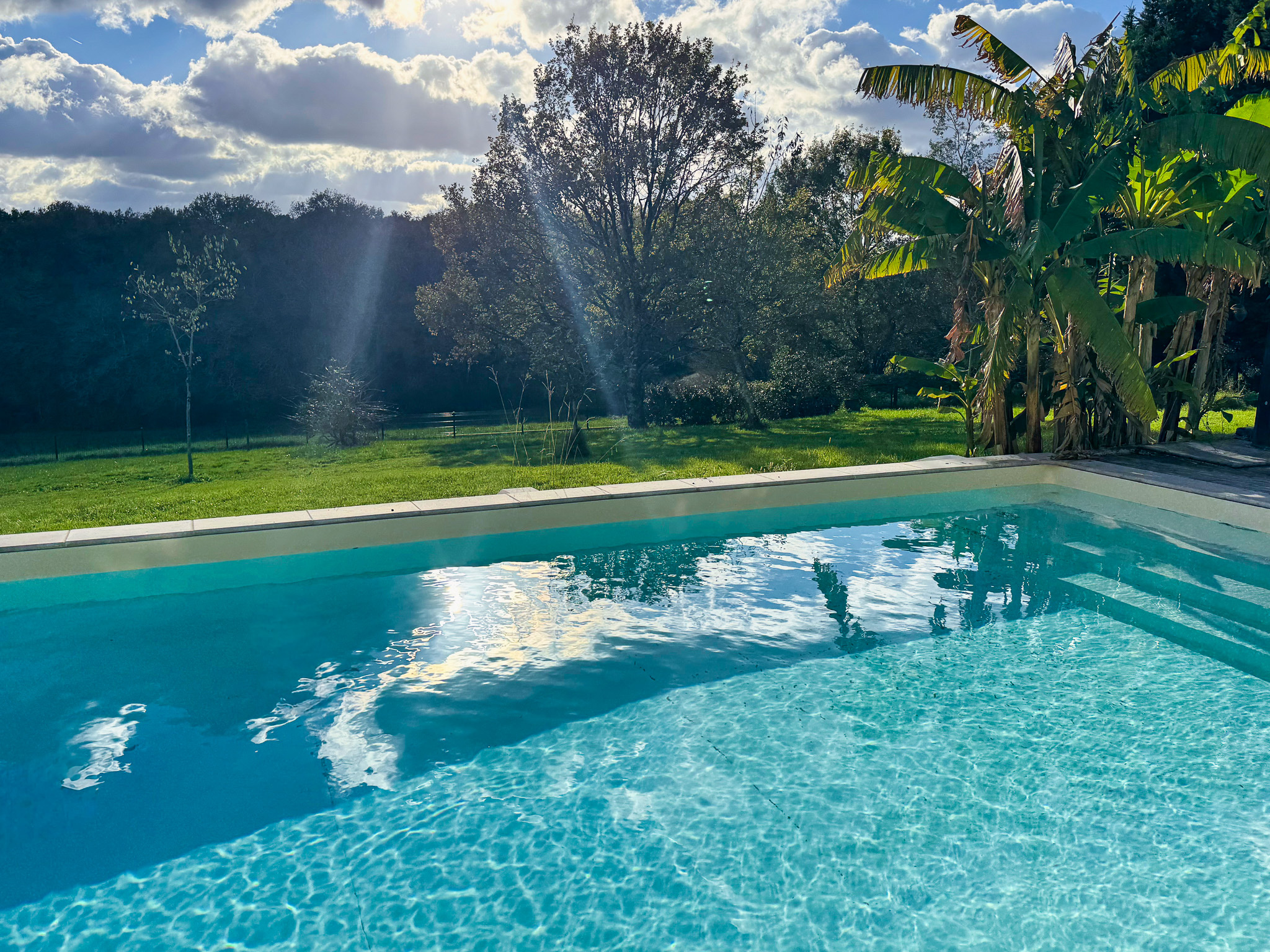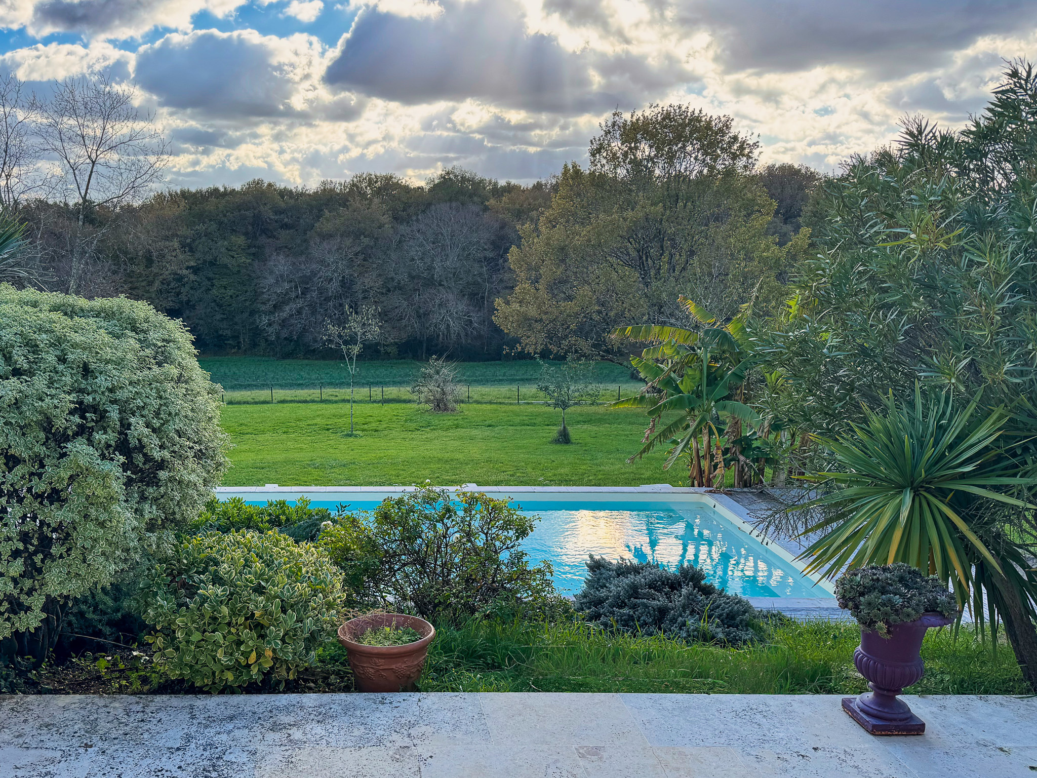 À l'extérieur, le terrain offre un véritable décor naturel. La piscine s'intègre parfaitement dans le paysage, créant un lieu de détente idéal pour profiter des journées ensoleillées. Depuis les terrasses et les différents angles du jardin, la vue se déploie sur les prairies verdoyantes, offrant un tableau changeant au fil des saisons, sans aucun vis-à-vis.