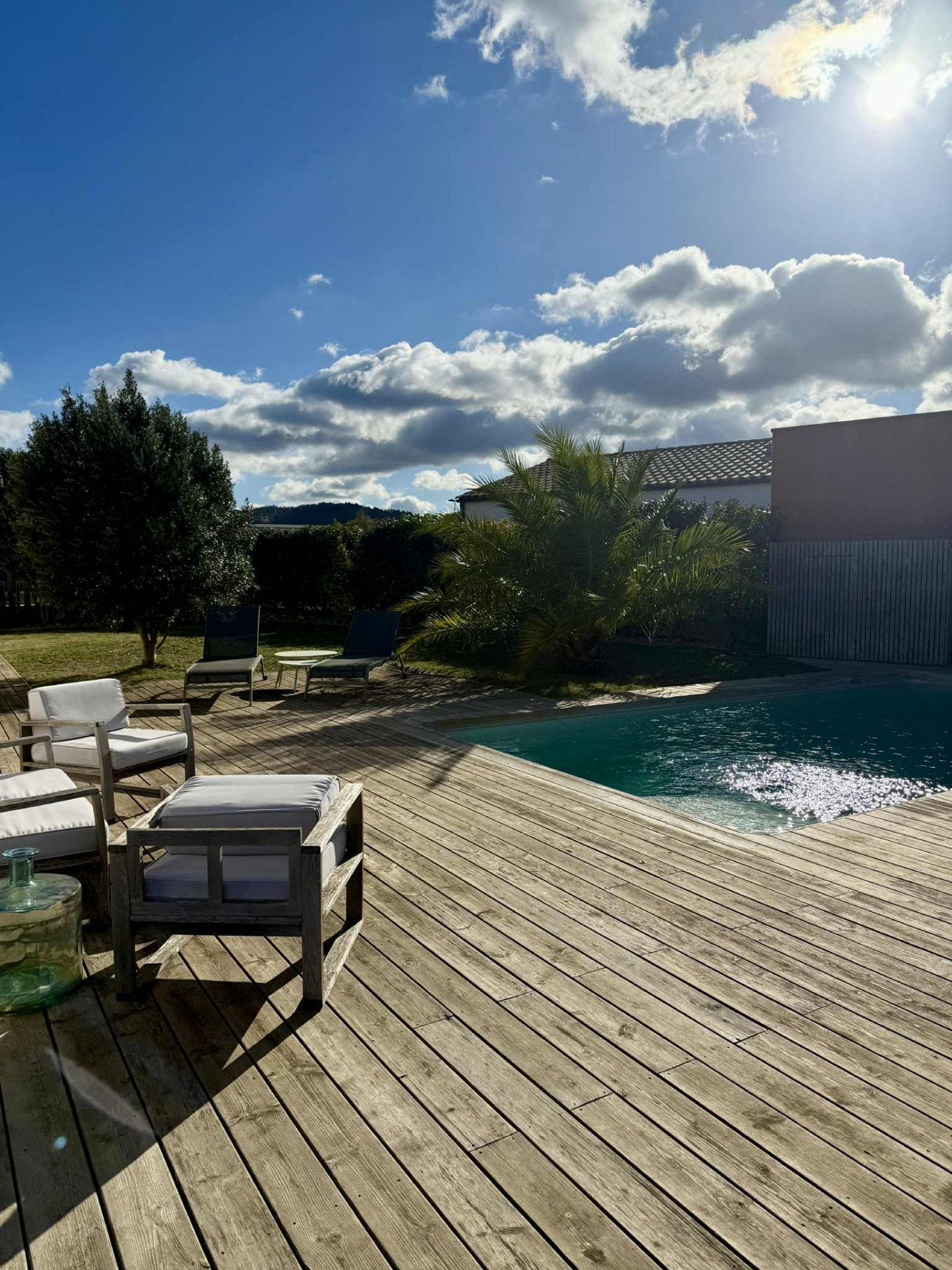 À l'extérieur, un véritable havre de paix vous attend, un jardin clos et paysagé, une terrasse en bois idéale pour les déjeuners en plein air, et une piscine 7 x 3 m offrant une vue sur les vignes environnantes.