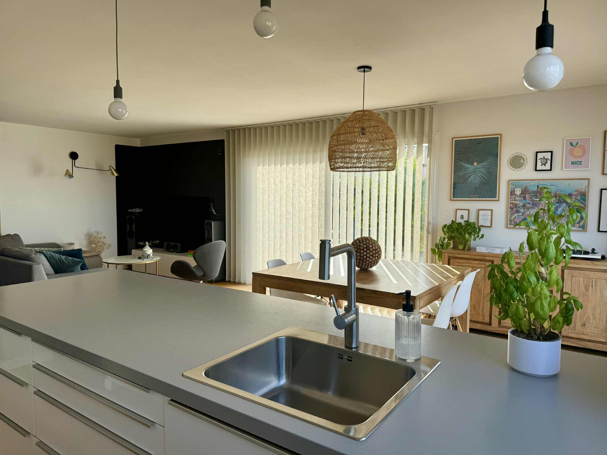 Dès l'entrée, vous serez séduits par la luminosité naturelle grâce aux larges baies vitrées qui ouvrent sur une terrasse en bois. La pièce de vie spacieuse et moderne, dotée d'une climatisation réversible et d'un poêle à granulés, crée une atmosphère chaleureuse et s'ouvre harmonieusement sur l'extérieur, idéal pour profiter des repas en plein air. Elle comprend également une cuisine américaine aménagée et équipée, un cellier attenant menant à un garage carrelé, ainsi qu'un coin bureau.