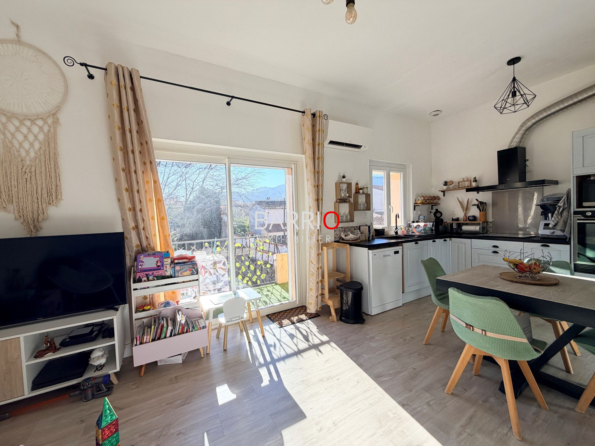 À l'étage principal, la maison s'ouvre sur un second hall, menant à une grande pièce à vivre lumineuse, avec une vue dégagée sur les Albères. Le balcon permet un accès direct au jardin. La cuisine ouverte, entièrement équipée, s'intègre parfaitement à l'espace de vie. Deux chambres confortables, une salle de bain moderne avec douche à l'italienne et WC ainsi que de nombreux rangements intégrés complètent ce niveau.