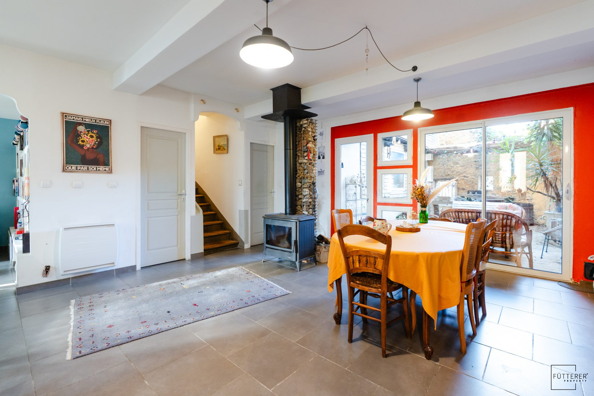 Le coeur de la maison est un espace de vie de plus de 50 m², baigné de lumière naturelle. Avec son poêle à bois, cette pièce invite à des soirées chaleureuses en famille ou entre amis. Elle s'ouvre sur une terrasse arborée, au sol en bois et entourée de pierres apparentes, un endroit idéal pour se détendre ou recevoir.