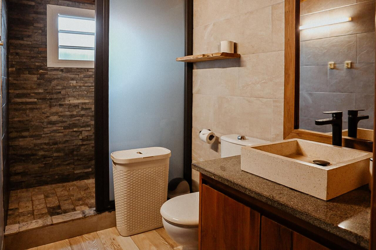 Surplombant la piscine, une suite parentale de plus de 22m² et un espace bain avec toilettes.