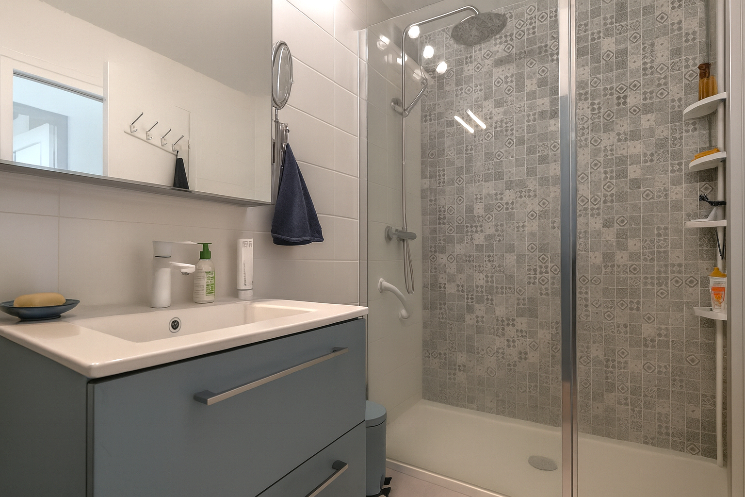 L'appartement comprend une belle pièce de vie se prolongeant sur la terrasse, une cuisine A/E donnant sur un balcon, 2 belles chambres dont une avec salle d'eau, 1 salle d'eau et wc séparés. En annexe, une cave et un garage en sous-sol avec portail électrique. Résidence emblématique, sécurisée avec gardien et court de tennis.