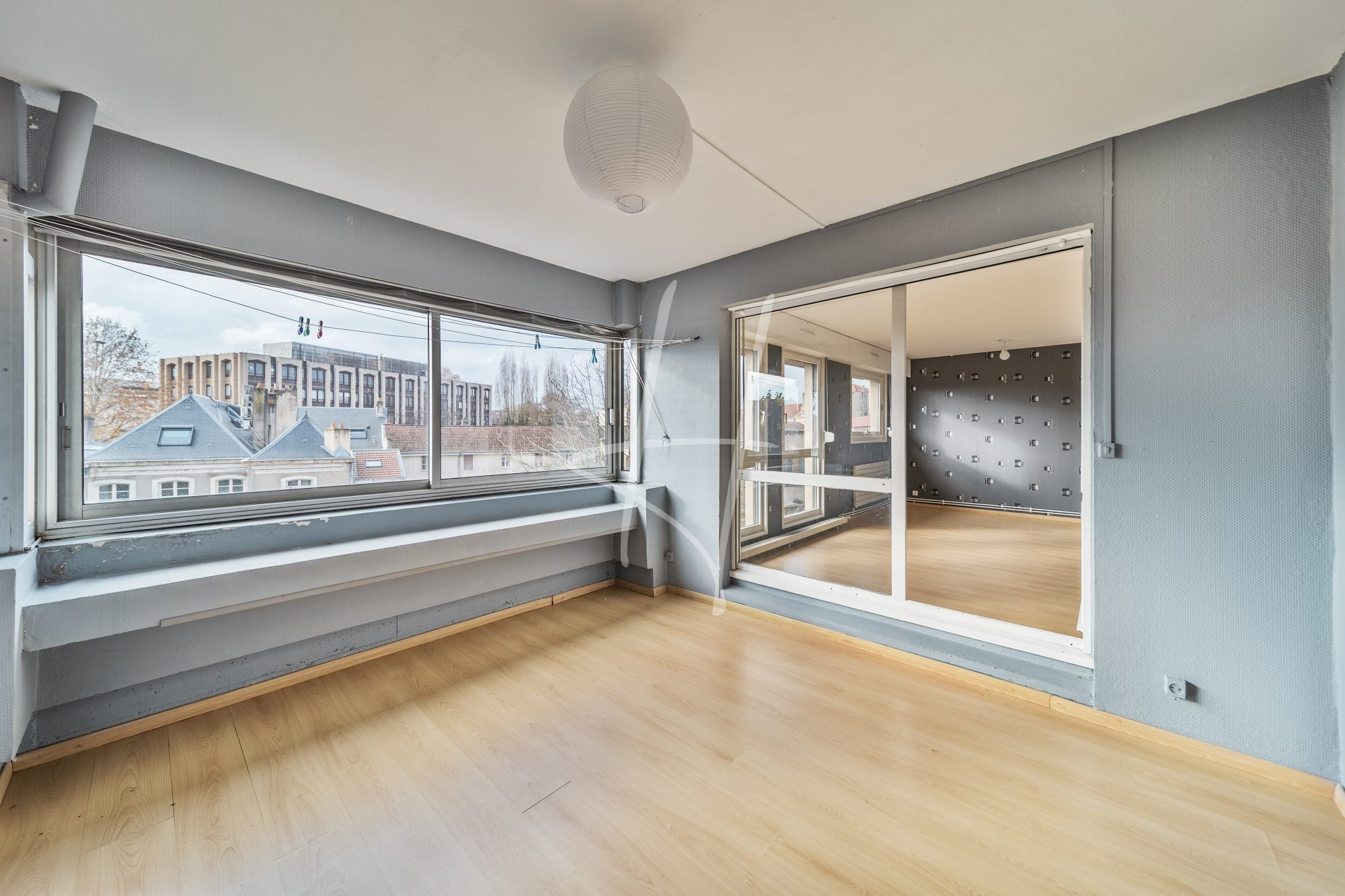 Metz-Centre, T4 traversant de 85 m² au 4e étage avec ascenseur. Double séjour sud, 2 ch, loggia fermée de 12 m2. Chauffage gaz individuel. Proche gare SNCF et centre-ville.