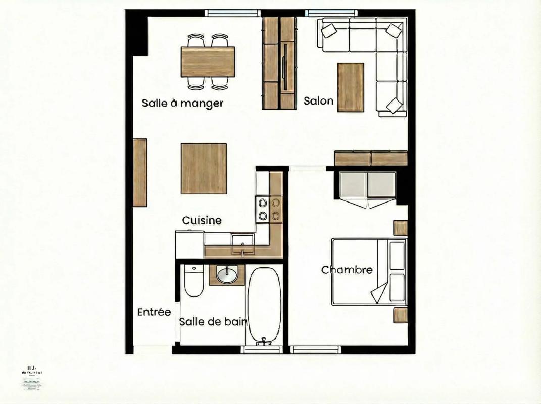 La chambre, intime et lumineuse, propose un espace de repos de 9,17 m², parfaitement proportionné et propice à la sérénité. La salle de bain, dotée d'une fenêtre - un atout rare dans le secteur - combine fonctionnalité et charme grâce à sa baignoire, sa vasque posée et son sol en carreaux graphiques. L'ensemble forme un appartement harmonieux, sans aucune perte d'espace, où chaque détail a été pensé pour offrir confort et douceur de vivre.
