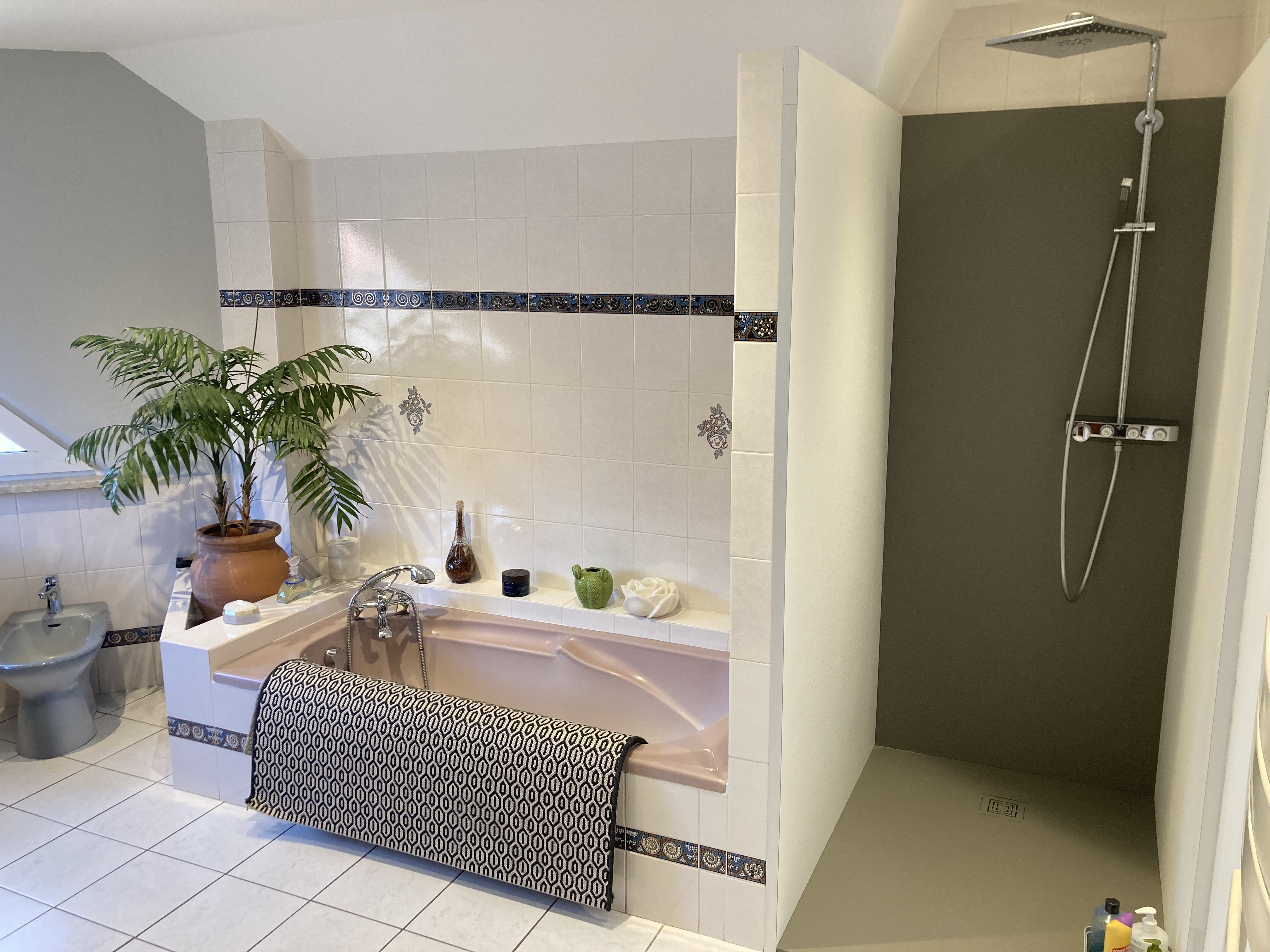 A l'étage : dégagement, 3 chambres, salle de bains avec baignoire et douche, toilettes séparées, suite parentale avec salle d'eau et dressings.