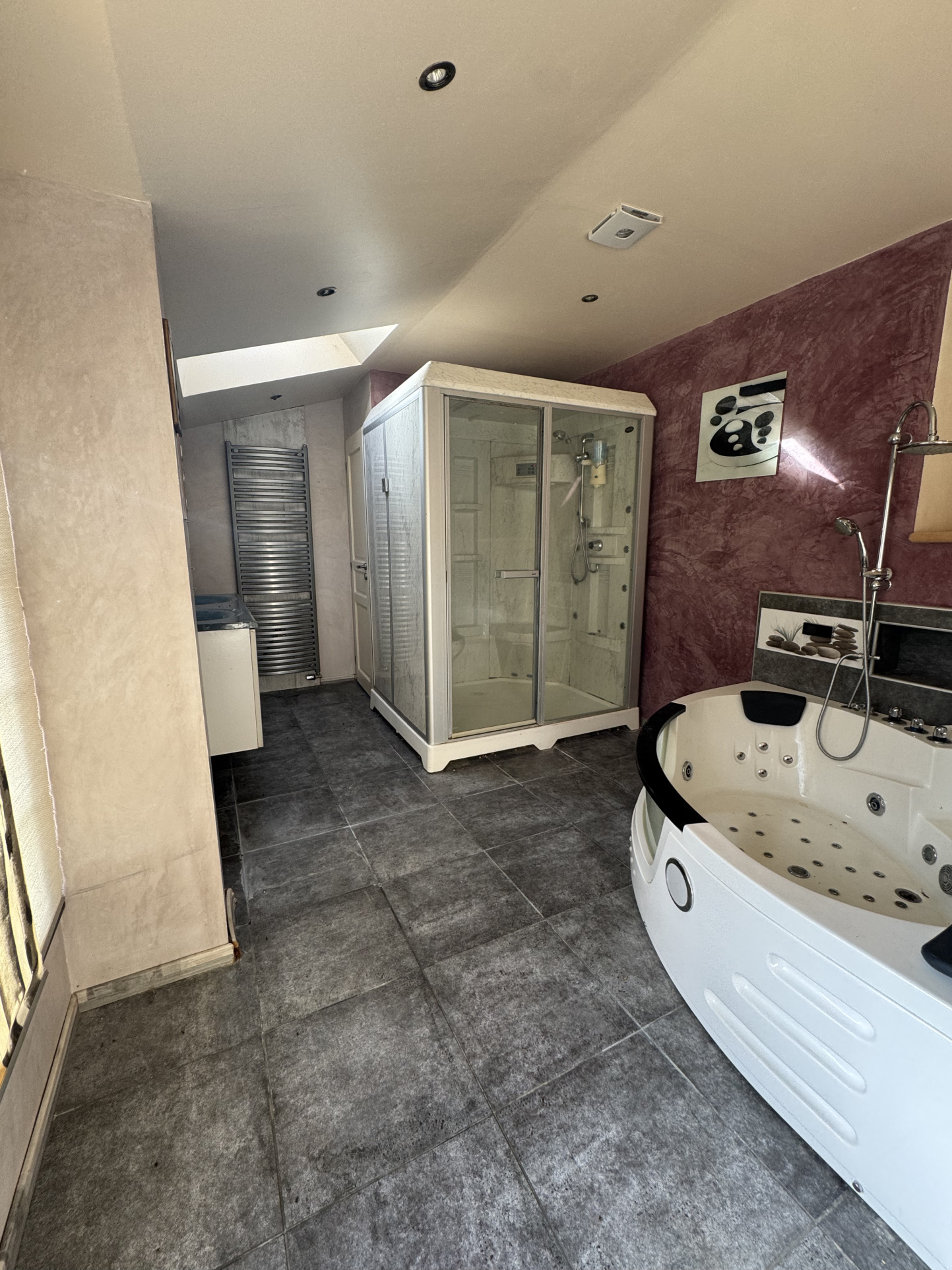 A l'étage, palier desservant deux chambres, salle de bain, WC, une chambre, une pièce passante, une suite parentale avec salle de bain (baignoire balnéo et douche hammam)