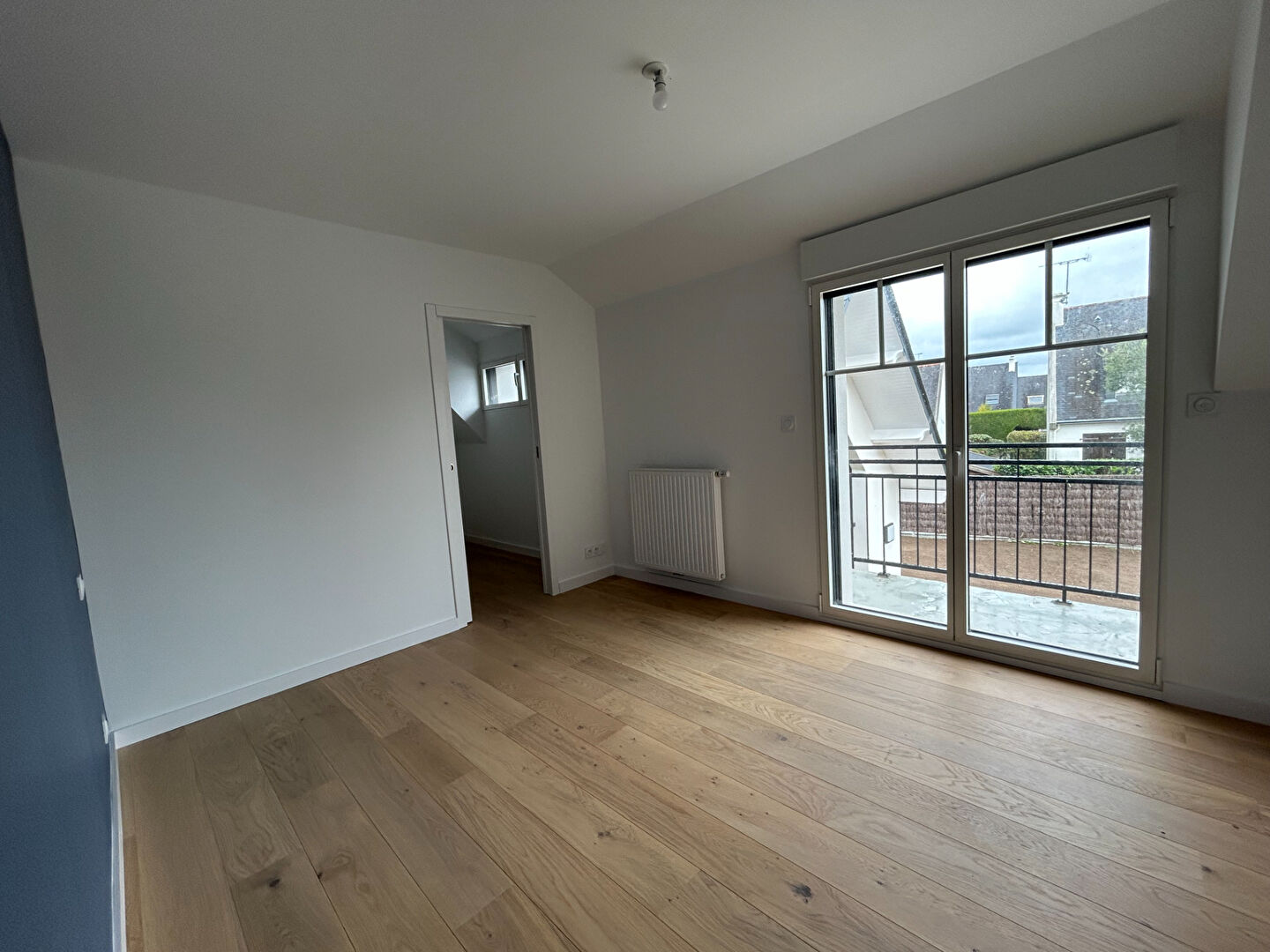 À l'étage, un palier distribue deux chambres, dont l'une dotée d'un balcon et d'un dressing, ainsi qu'une salle d'eau et des toilettes séparées. De nombreux rangements y sont prévus.