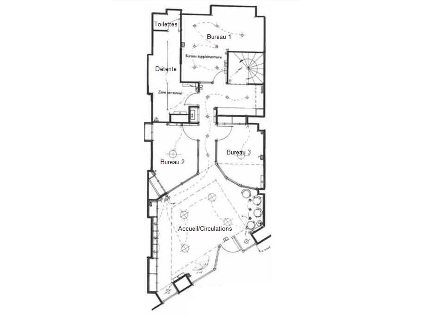 - Rez-de-chaussée de 76 m² : vaste espace d'accueil avec vitrine, complété par deux bureaux fermés permettant de recevoir en toute confidentialité.